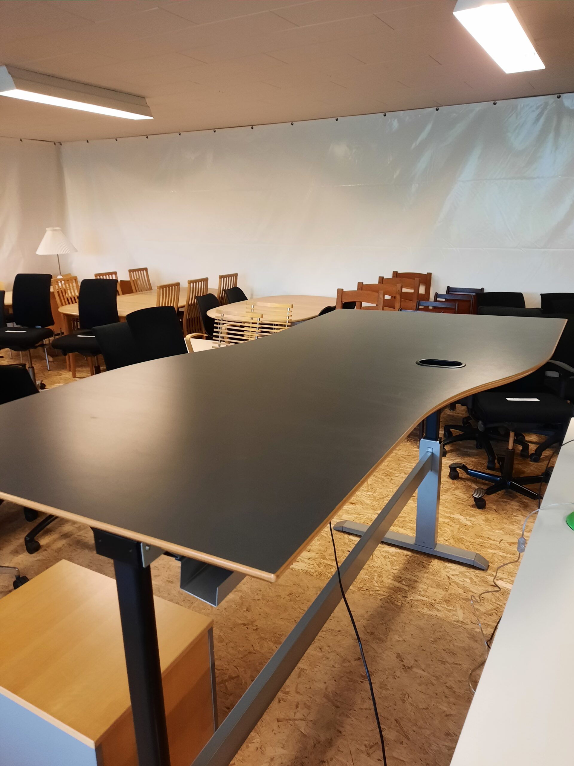 Smukt hæve/sænke skrivebord med buet bordplade, hvilket er ideelt, hvis man skal sidde 2 personer ved bordet samtidigt (skråt overfor hinanden). Skrivebordet fremstår i pæn stand, dog er der nogle ridser/skrammer på pladen, og også hul på den yderste plastbelægning på ledningen få steder – se billederne! Højdeindstilling fra 67-117 cm, som bevirker, at man både kan sidde eller stå ved bordet, når man arbejder. Betjeningspanel med op/ned funktion og desuden mulighed for at indstille 2 forskellige højdeindstillinger som primære højder (knap 1 og 2). Disse indstillinger kan altid ændres, hvis man ønsker det. Bordets mål er L(B):200 og D: 100 cm.