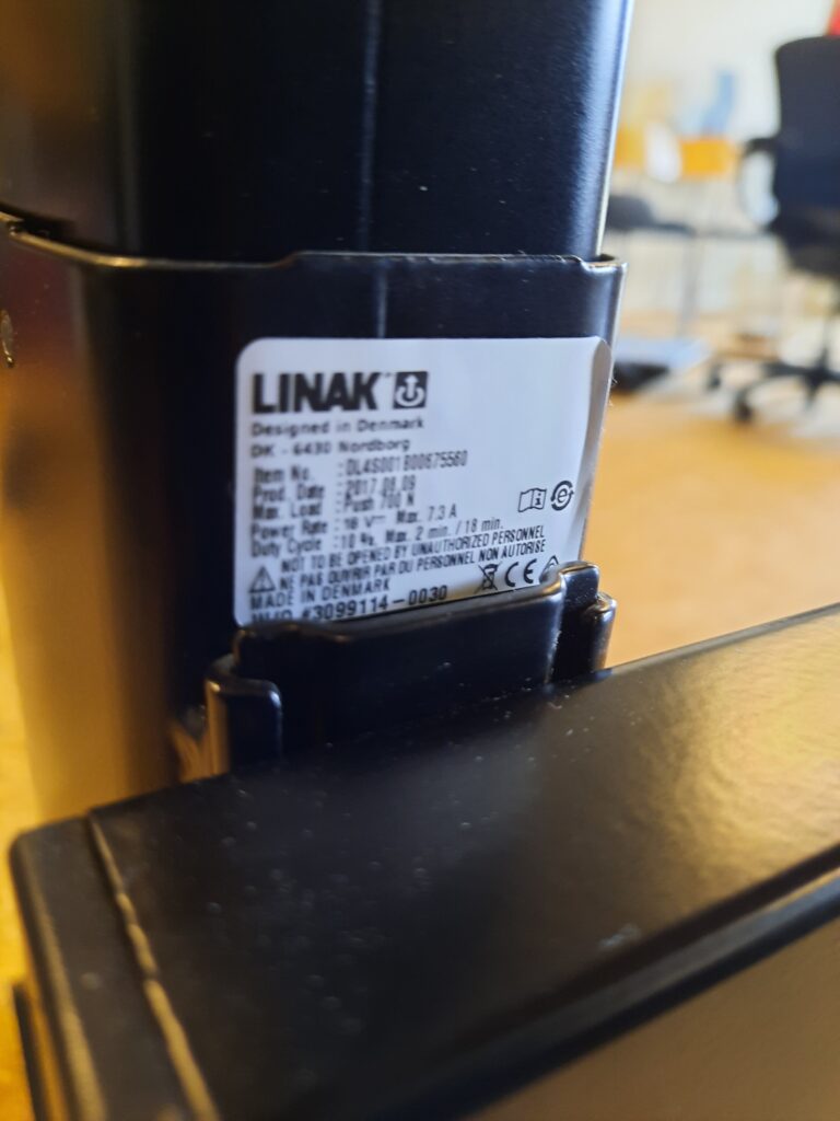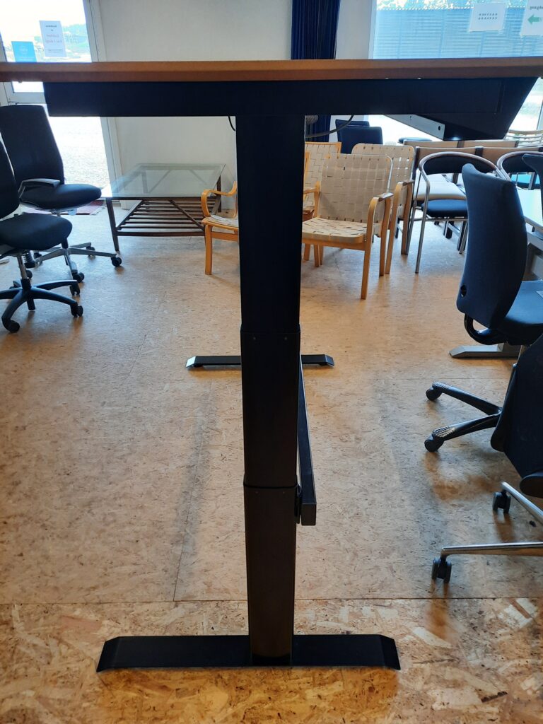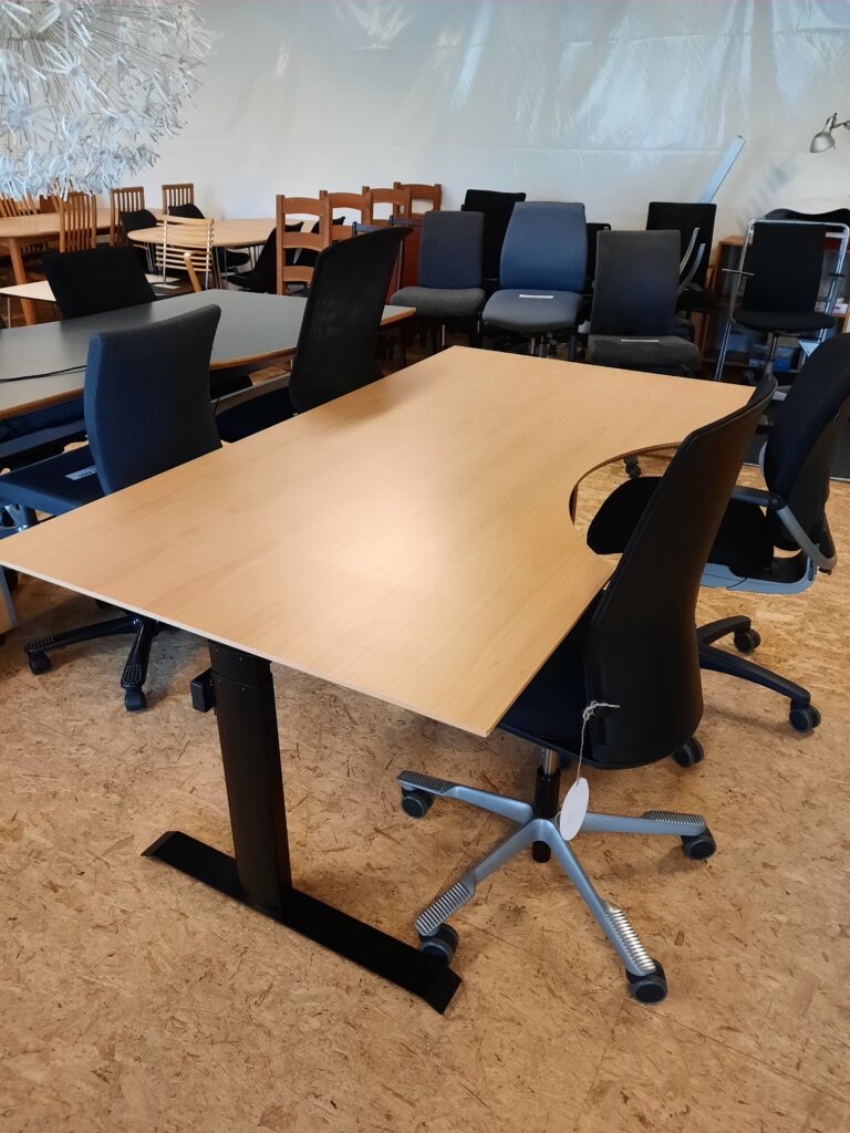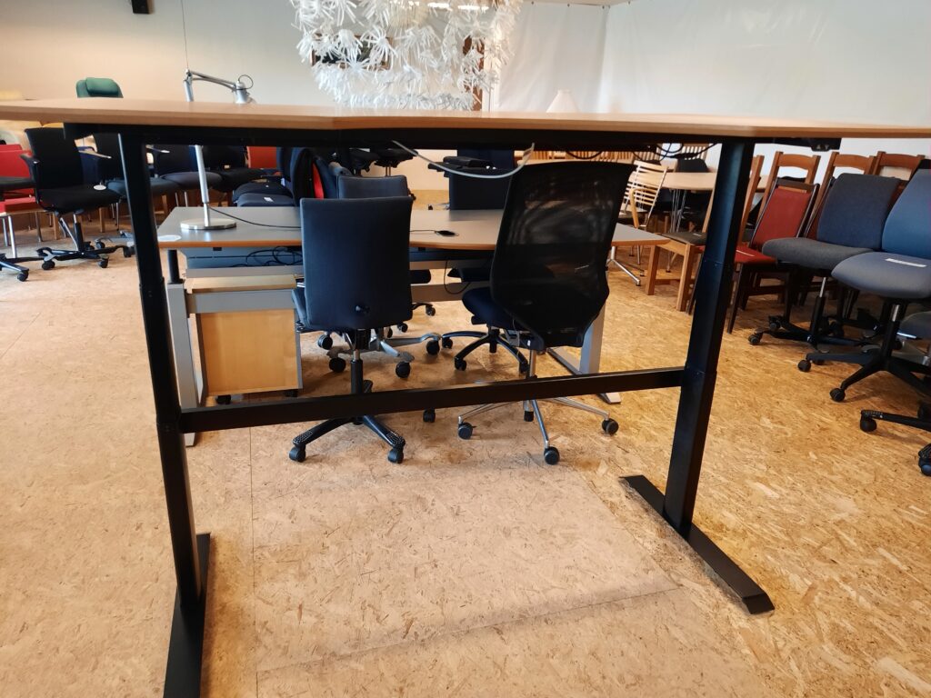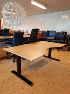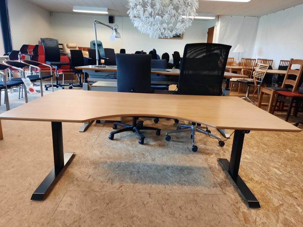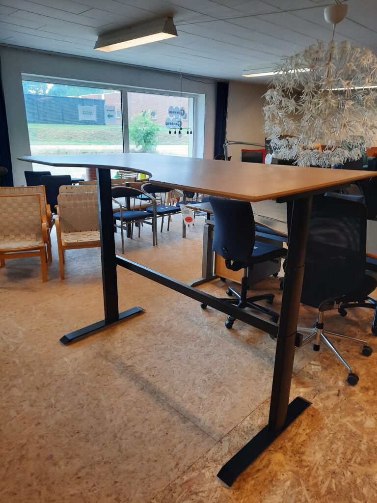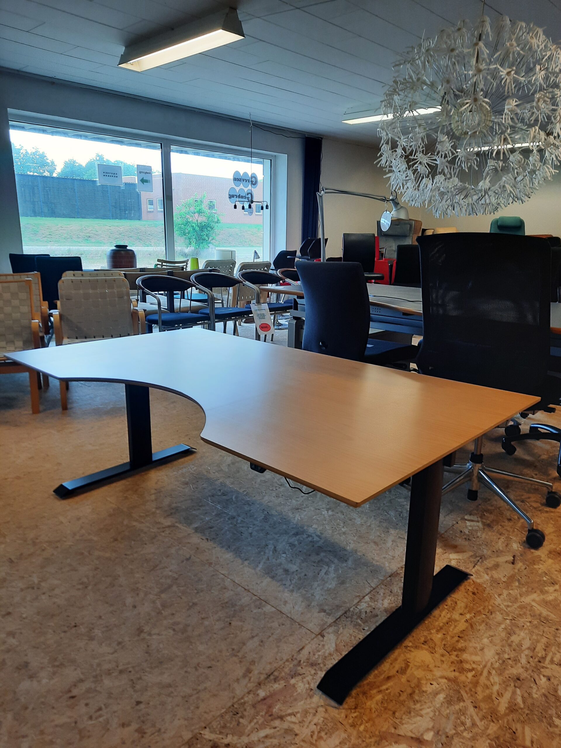 Dette smukke bord med Linak hæve-/sænkesystem måler 180 cm i længden og 100 cm i bredden/dybden. I buen er bredden/dybden 80 cm. Bordet er velegnet til 1 person, som kan sidde tæt og behageligt ind til bordet, samtidig med at alt på bordet er indenfor kort rækkevidde, grundet buen i midten. Bordet har en højdeindstilling fra 64-131 cm. Smart kabelbakke monteret under bordpladen til opbevaring af ledningen. Bordet er med sort stel/fødder, som også kan justeres, så bordet står lige, selv hvis underlaget er skævt. Bordet fremstår i pæn stand, med almindelige brugsspor.