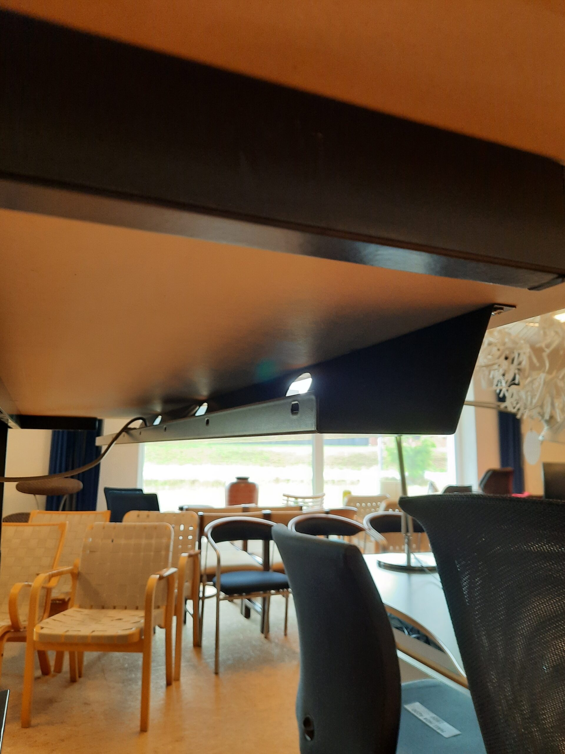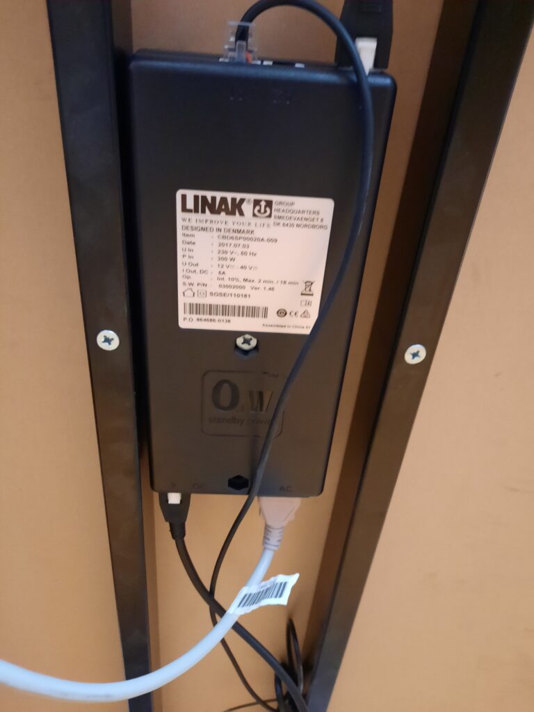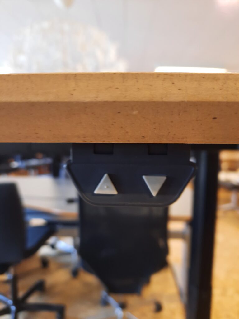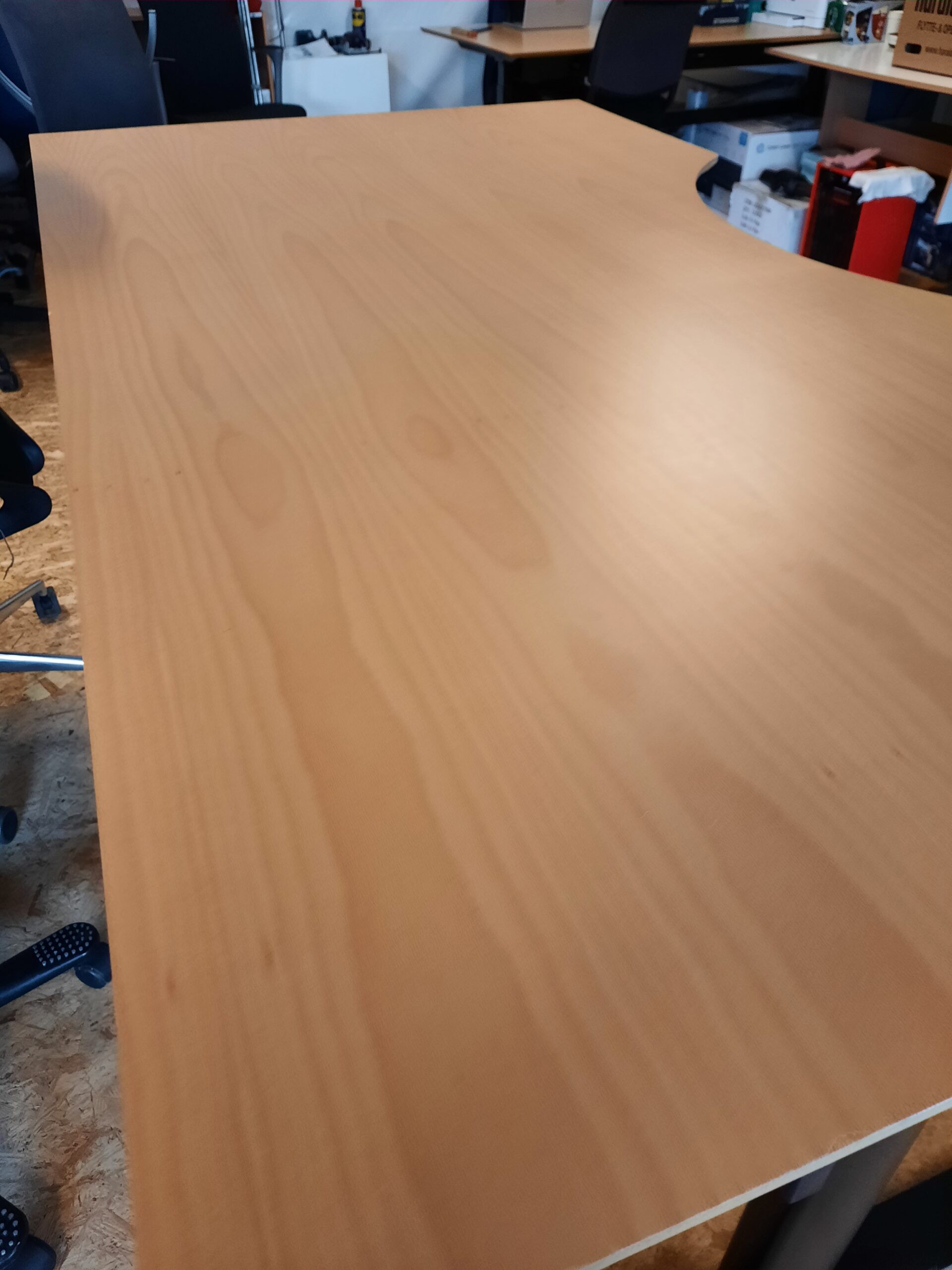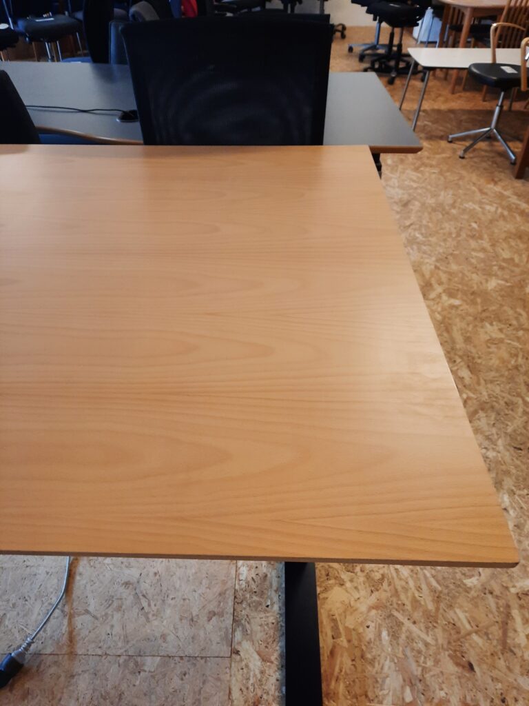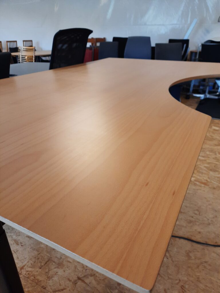 Dette smukke bord med Linak hæve-/sænkesystem måler 180 cm i længden og 100 cm i bredden/dybden. I buen er bredden/dybden 80 cm. Bordet er velegnet til 1 person, som kan sidde tæt og behageligt ind til bordet, samtidig med at alt på bordet er indenfor kort rækkevidde, grundet buen i midten. Bordet har en højdeindstilling fra 64-131 cm. Smart kabelbakke monteret under bordpladen til opbevaring af ledningen. Bordet er med sort stel/fødder, som også kan justeres, så bordet står lige, selv hvis underlaget er skævt. Bordet fremstår i pæn stand, med almindelige brugsspor.
