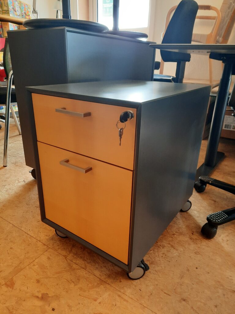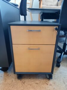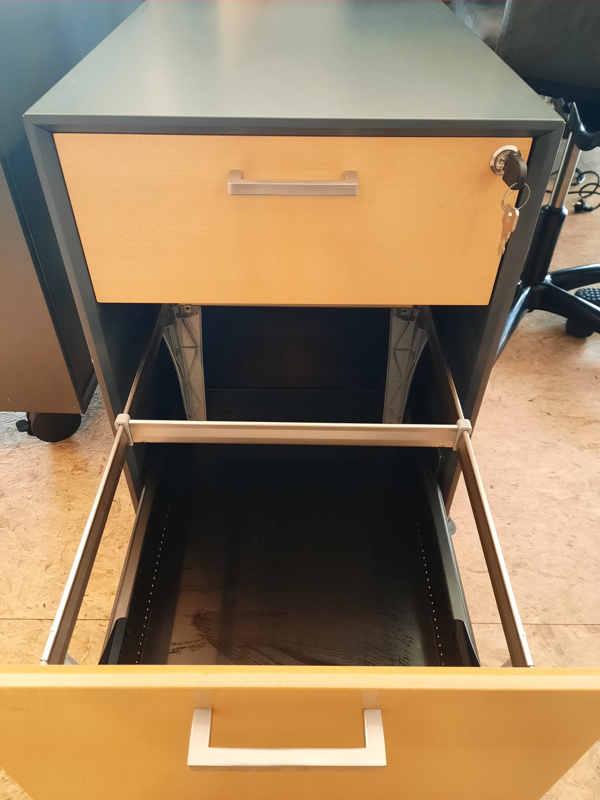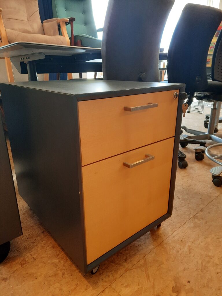 Skuffemodul med sider og top/bund i grålakeret træ, samt 2 skuffer i lyst træ, med metalgreb. I øverste skuffe er der en lille bakke til opbevaring af diverse kontorartikler. Modulet er let at flytte rundt på, da der er påmonteret hjul under bunden. De to forreste hjul er låsbare. Hjulene er velegnet til hårde gulve. Modulet har flg. mål: H. 60 B. 43 D. 61 cm. Der medfølger to nøgler, så man har mulighed for at låse skufferne. Skuffemodulet fremstår almindelige brugsspor, såsom mindre ridser og kanthak. Lagerbestand: 2 stk. 1 tilbage!