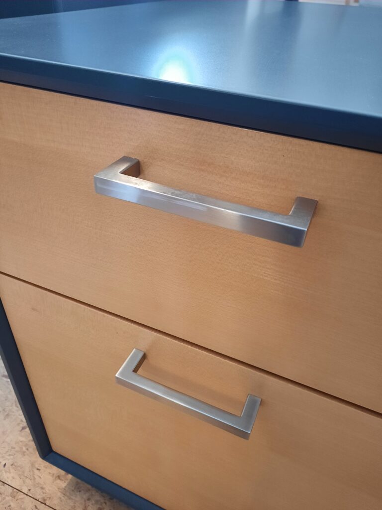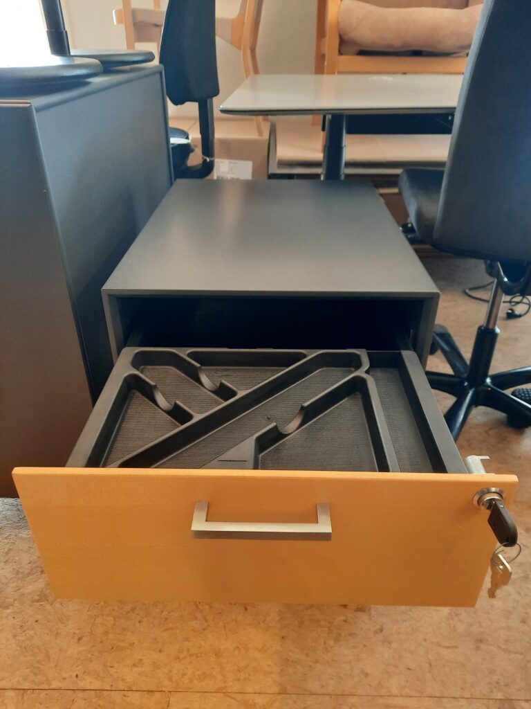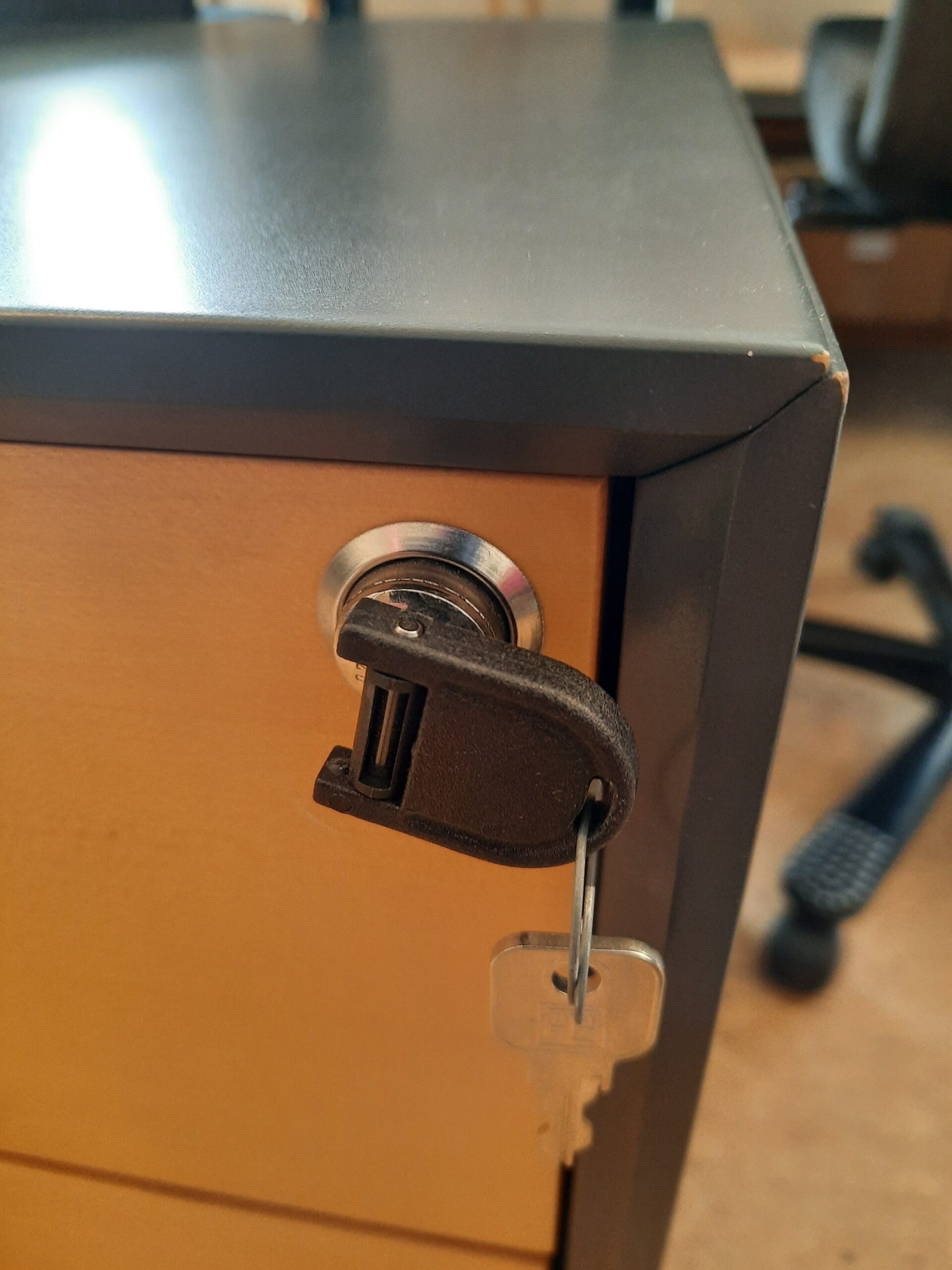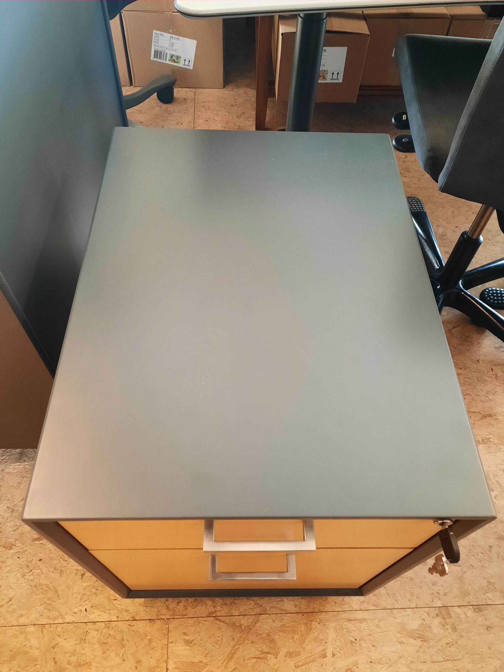 Skuffemodul med sider og top/bund i grålakeret træ, samt 2 skuffer i lyst træ, med metalgreb. I øverste skuffe er der en lille bakke til opbevaring af diverse kontorartikler. Modulet er let at flytte rundt på, da der er påmonteret hjul under bunden. De to forreste hjul er låsbare. Hjulene er velegnet til hårde gulve. Modulet har flg. mål: H. 60 B. 43 D. 61 cm. Der medfølger to nøgler, så man har mulighed for at låse skufferne. Skuffemodulet fremstår almindelige brugsspor, såsom mindre ridser og kanthak. Lagerbestand: 2 stk. 1 tilbage!