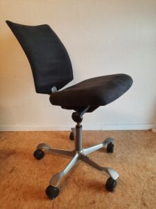 HÅG H05 5400 er en smuk og stilfuld kvalitetsstol fra norske HÅG. Stolen er med gråt comfort stof, den har et mellem højt rygstykke, som kan højdejusteres. Siddehøjden kan indstilles fra 50 til hele 66 cm. Den har flydende vip og kan også låses fast i 3 positioner (forover, horisontalt og bagover). Derudover kan sædedybden reguleres. Stolen er med fodkryds i aluminium, hvorpå der er skridsikre fodstøtter. Den er i pæn stand, med almindelige brugsspor, blandt andet er der et mærke i stoffet på ryggen fra et klistermærke eller lignende (se billede).