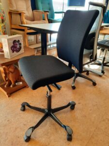 H04 4200 fra HÅG er en skøn og smuk stol med mange indstillingsmuligheder. Stolen er betrukket med sort Fame stof, med en slidstyrke på 200.000 Martindale. Siddehøjden kan indstilles fra 50 til 66 cm, ryggen kan højdejusteres, sædet kan vippe forover eller bagover, man kan låse den fast i 3 forskellige positioner og sædedybden kan justeres. Sort lakeret fodkryds med 5 ben og skridsikker belægning til fødderne. Hjul: velegnet til tæpper. Stolen er i pæn stand, med almindelige brugsspor. Lagerbestand: 1 stk.