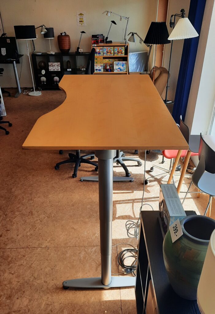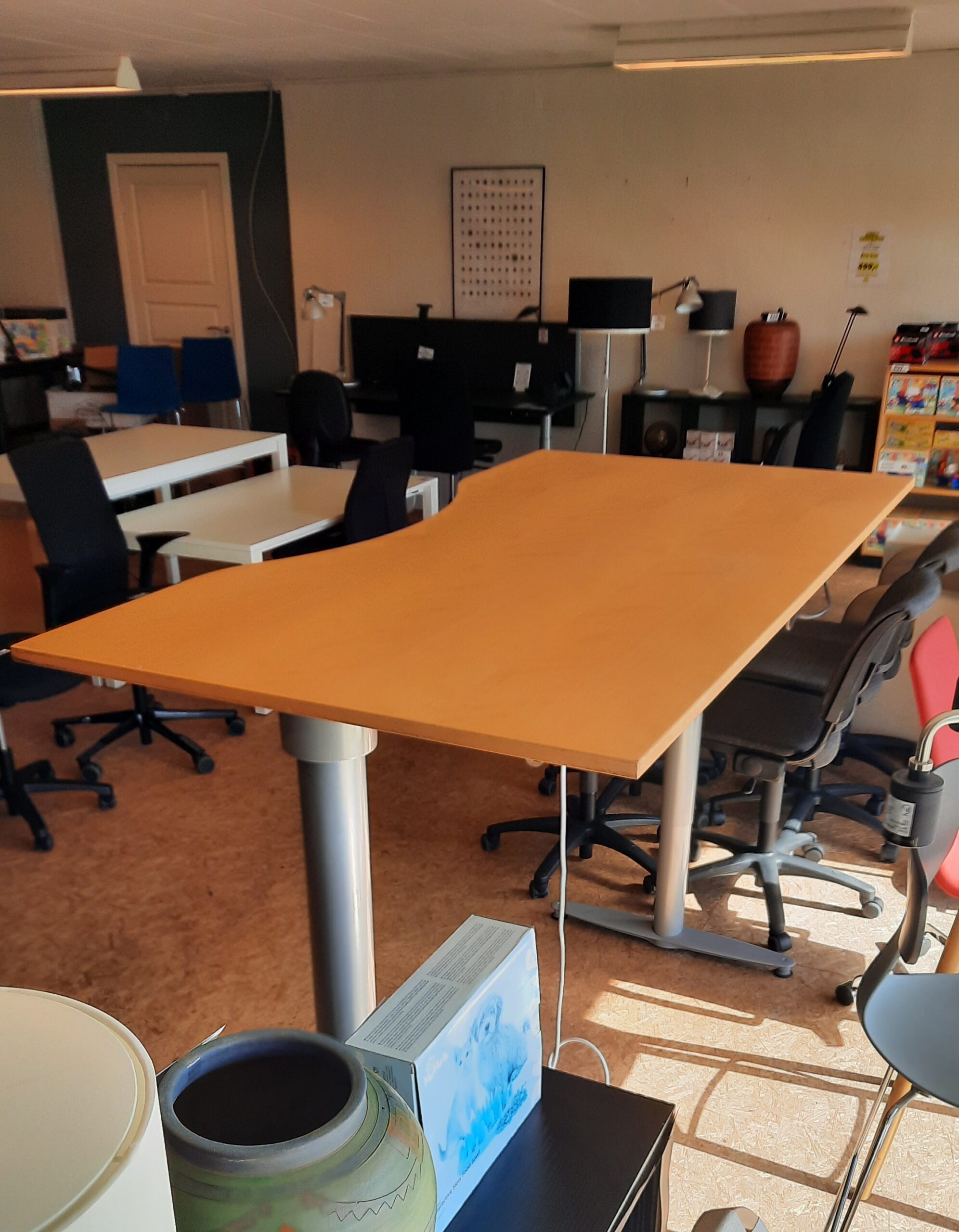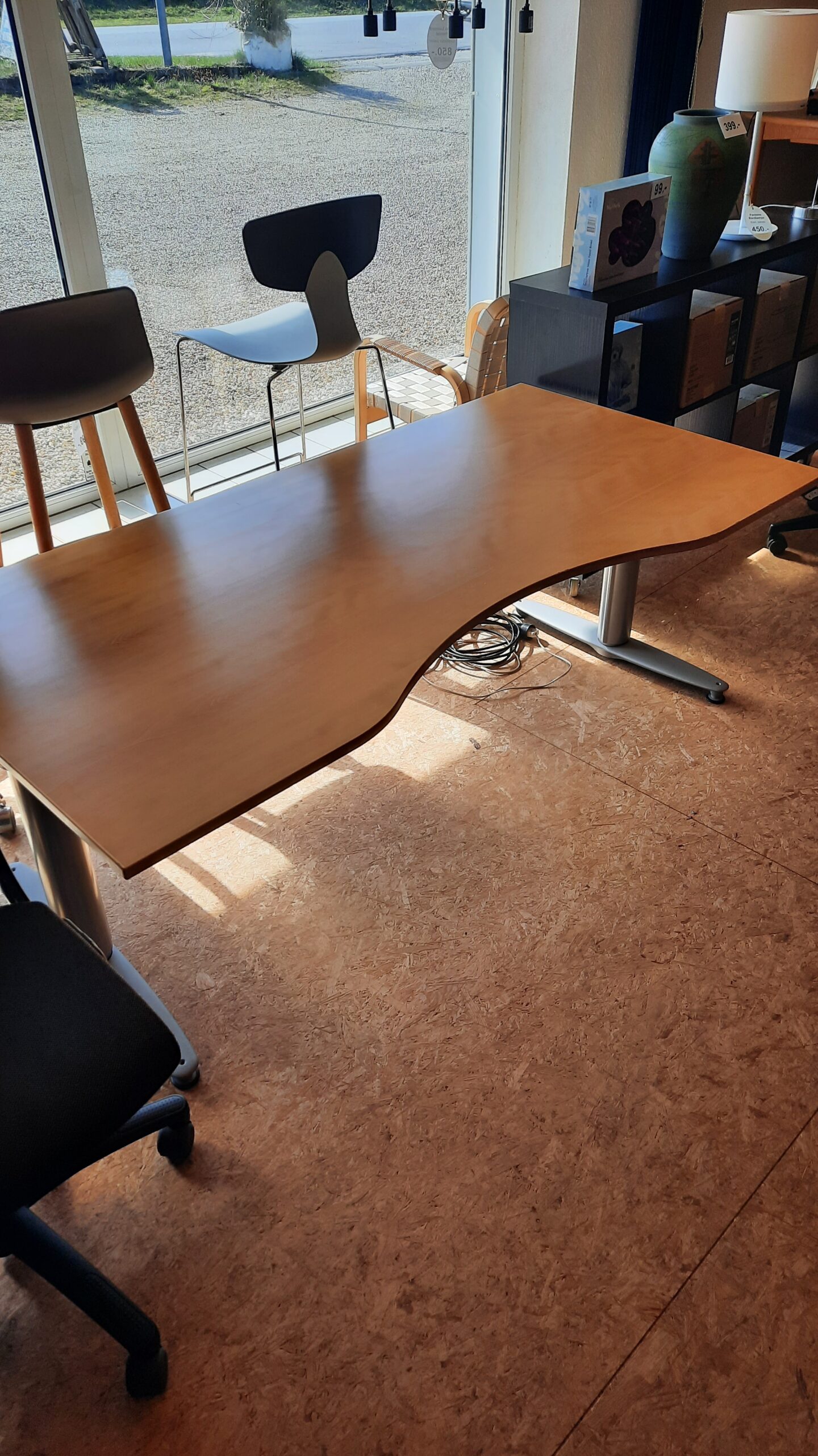 Kinnarps el hæve/sænkebord str. 180×90 cm. Bordplade i bøge laminat, med indvendig bue. Bordet er med 2-ledet stel, på højdejusterbare fødder. Arbejdshøjden kan indstilles fra ca. 64-128 cm. Bordet er med hæve-/sænkekontakt i højre side. Kabelbakke er monteret under bordpladen. Bordet fremstår med almindelige brugsspor. Lagerbestand: 1 stk.