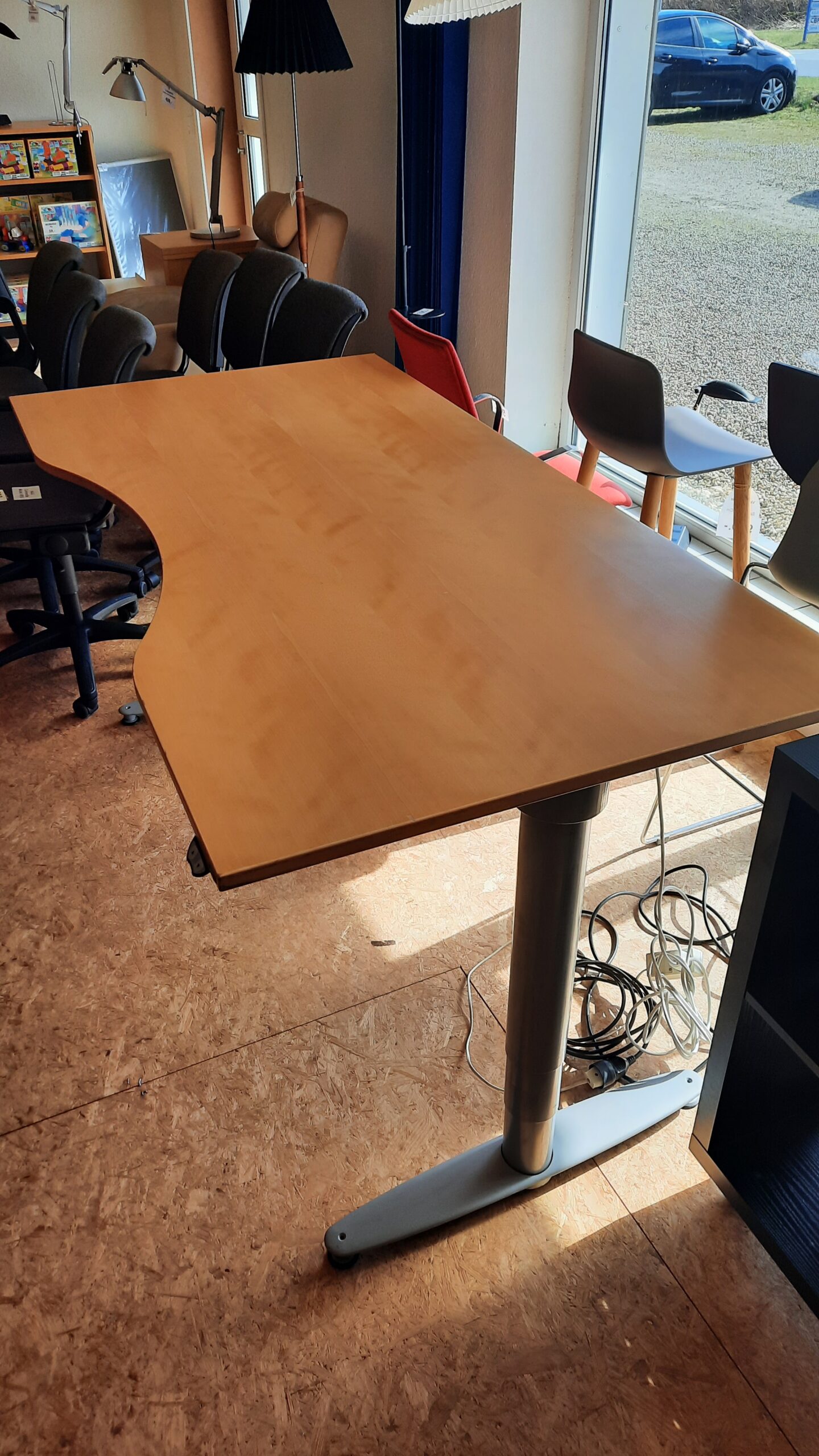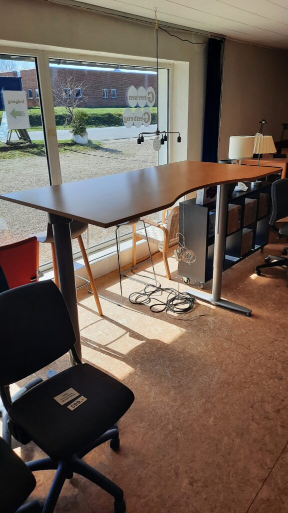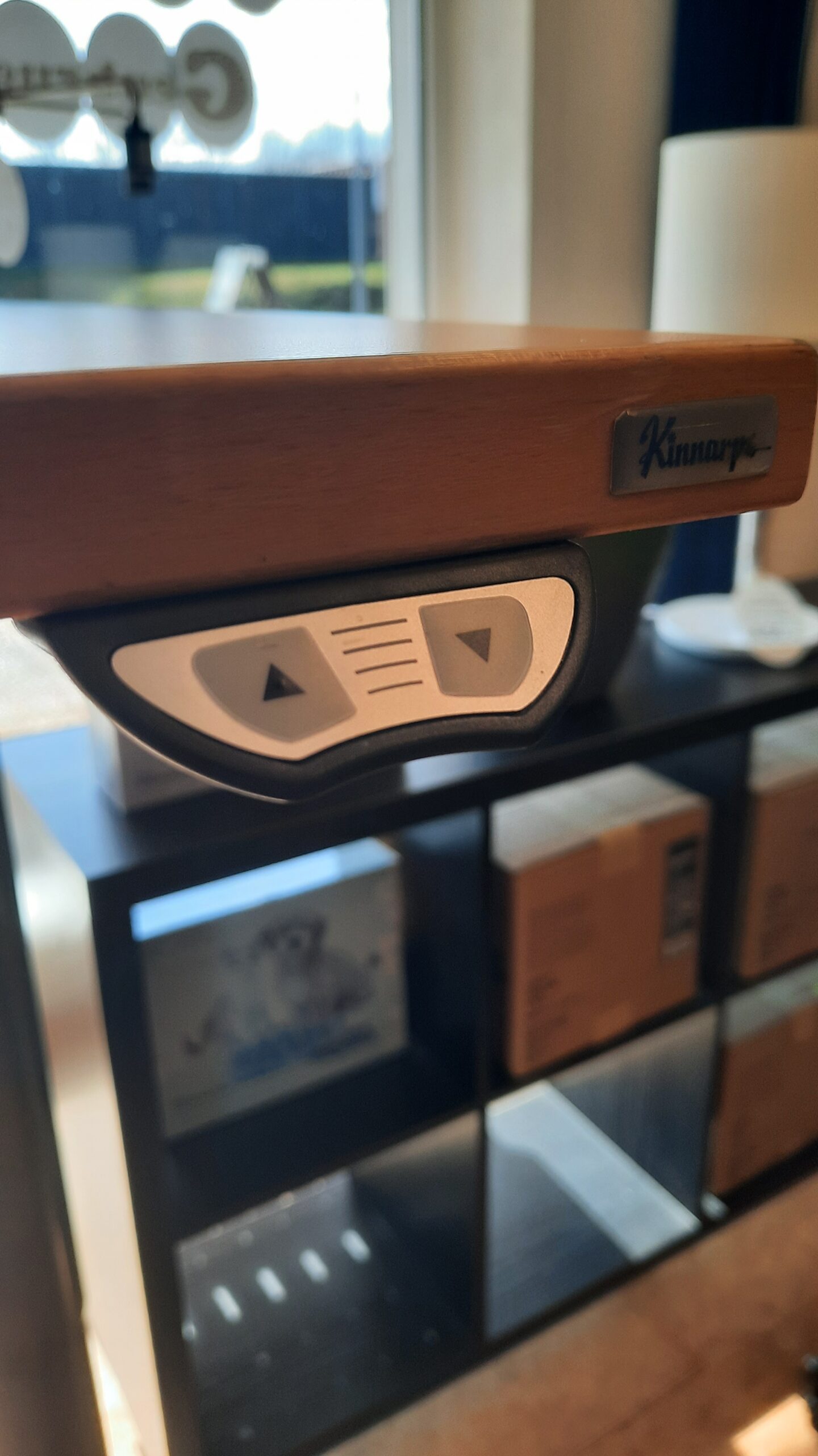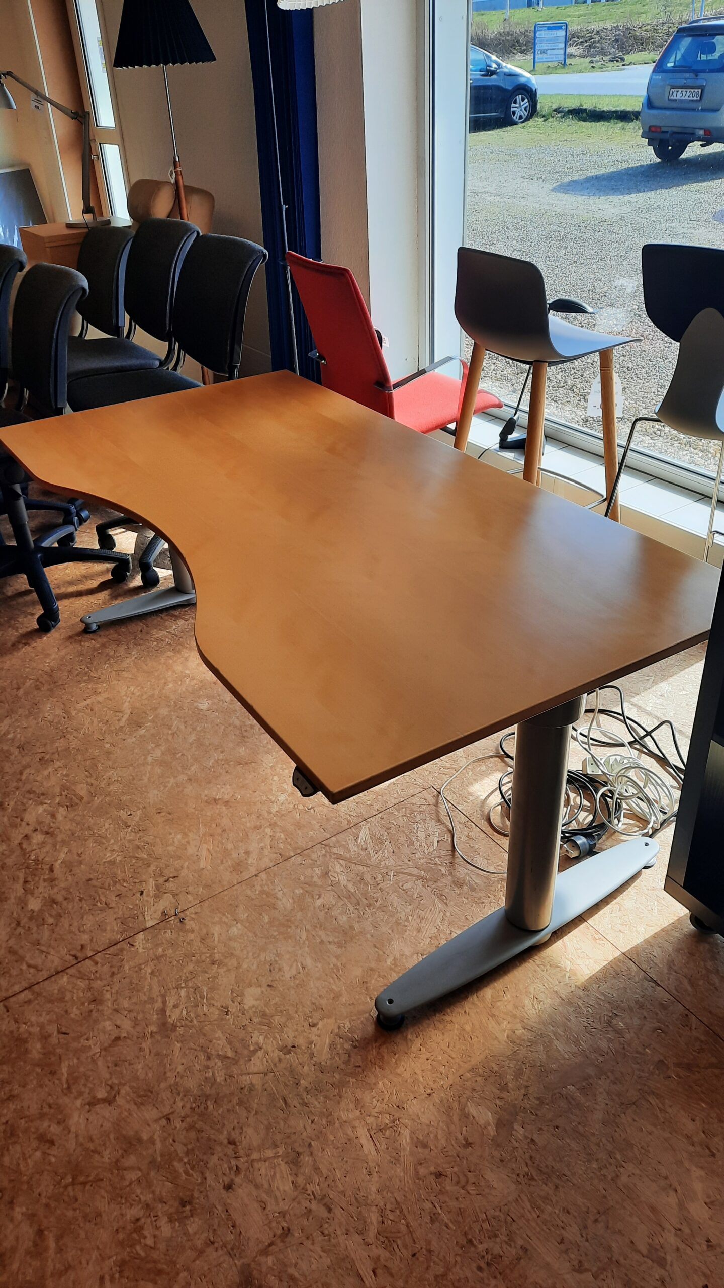 Kinnarps el hæve/sænkebord str. 180×90 cm. Bordplade i bøge laminat, med indvendig bue. Bordet er med 2-ledet stel, på højdejusterbare fødder. Arbejdshøjden kan indstilles fra ca. 64-128 cm. Bordet er med hæve-/sænkekontakt i højre side. Kabelbakke er monteret under bordpladen. Bordet fremstår med almindelige brugsspor. Lagerbestand: 1 stk.