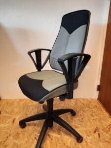 Fin stol fra svenske Kinnarps, som kan indstilles i højden fra 44-54 cm. Stolen er med højde- og sidejusterbare armlæn. Den har sædeforskydning frem og tilbage, rygstykket kan justeres i højden, freeflow funktion, samt fastlåsning i diverse positioner. Desuden har stolen sædevip og fembenet fodkryds med hjul, som er velegnet til hårde gulve. Stolen er med almindelige brugsspor, såsom nogle pletter i stoffet. Derudover er plastrosetterne under sædet beskadiget. Det er dog kun af kosmetisk betydning.