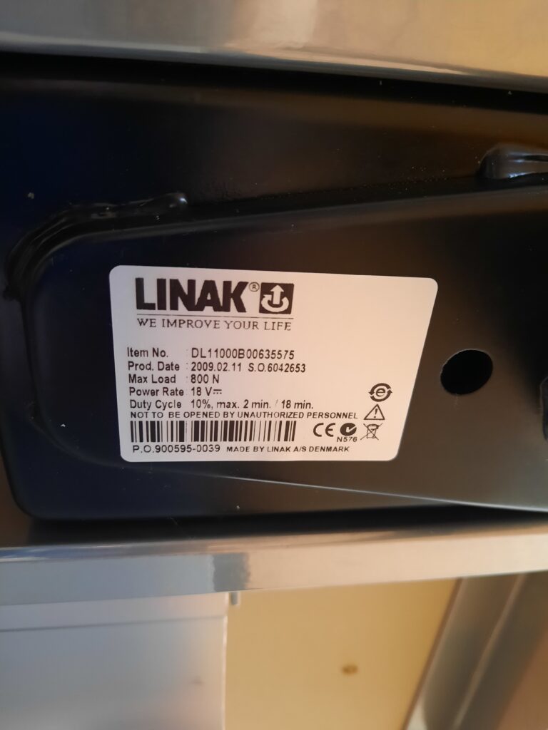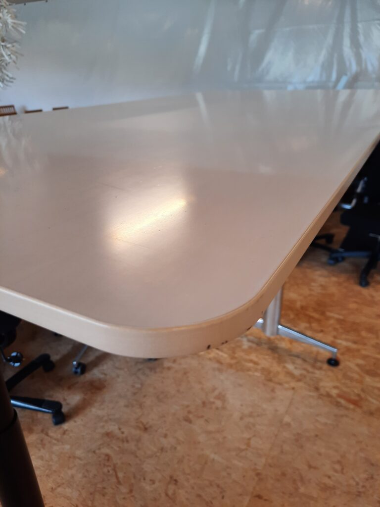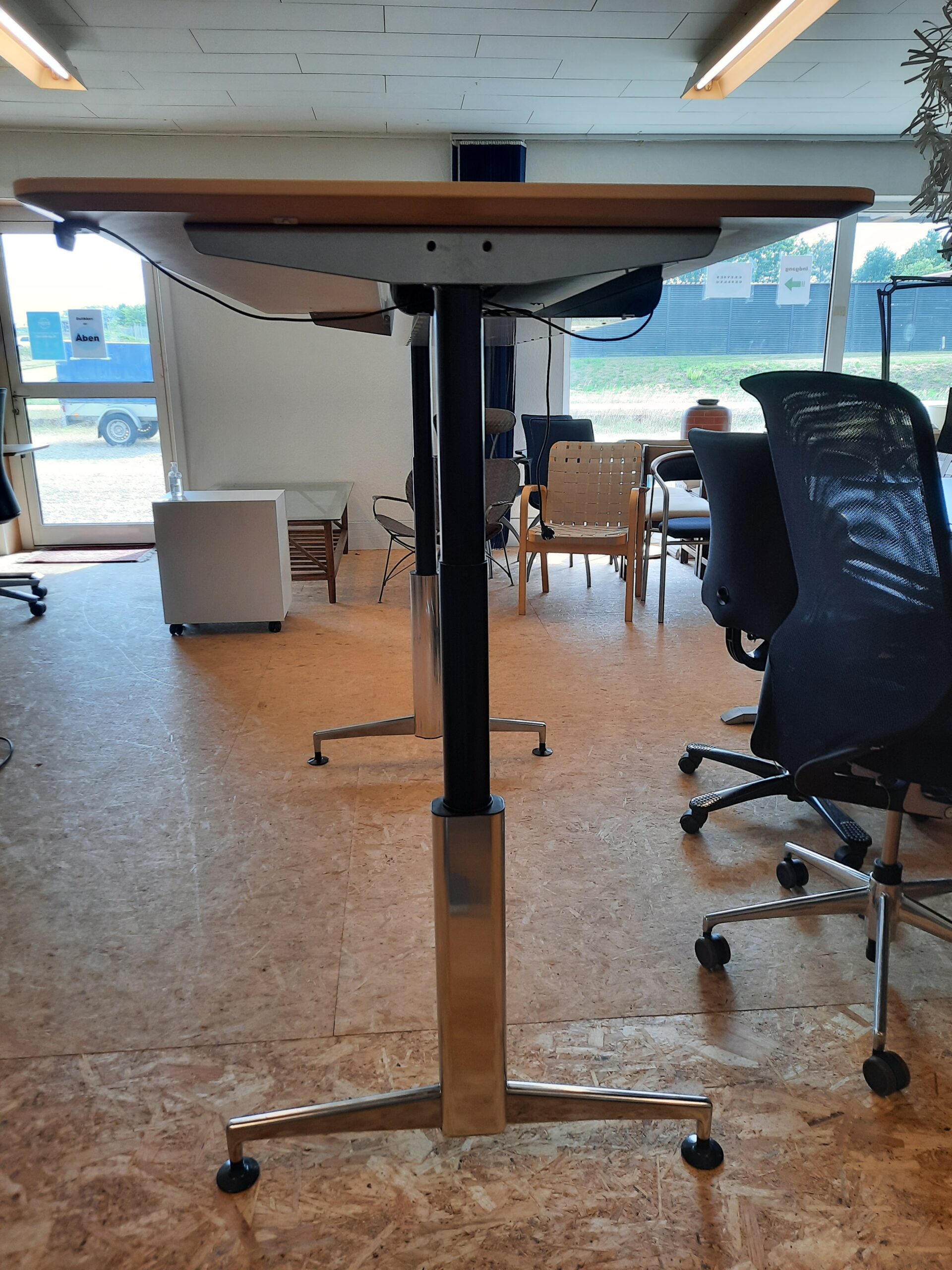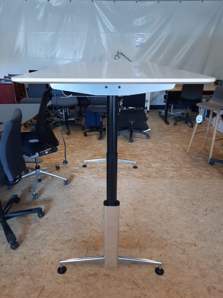 Super lækkert el hæve/sænkebord designet af Asger Soelberg. Modellen er A-One og bordpladen har en størrelse på 90×180 cm. Arbejdshøjden kan indstilles fra 70-134 cm. Stellet er i blankt aluminium, der er kabelbakke under bordpladen til ledninger og desuden kan man smart fastsætte ledning til hæve/sænk kontakten i en clips under pladen. Bordet er i pæn stand, med almindelige brugsspor, såsom mindre ridser og mærker på bordplade og stel.
