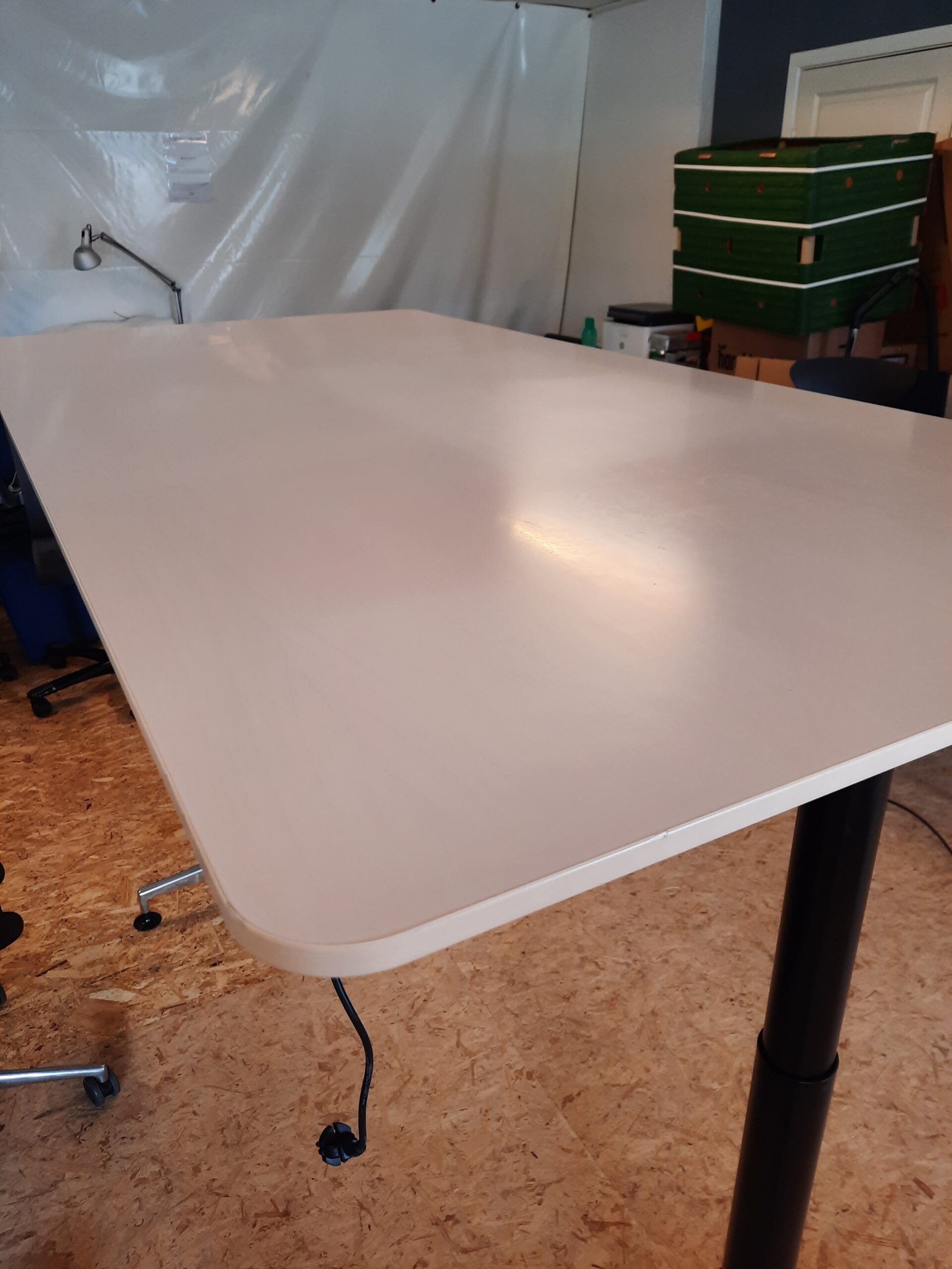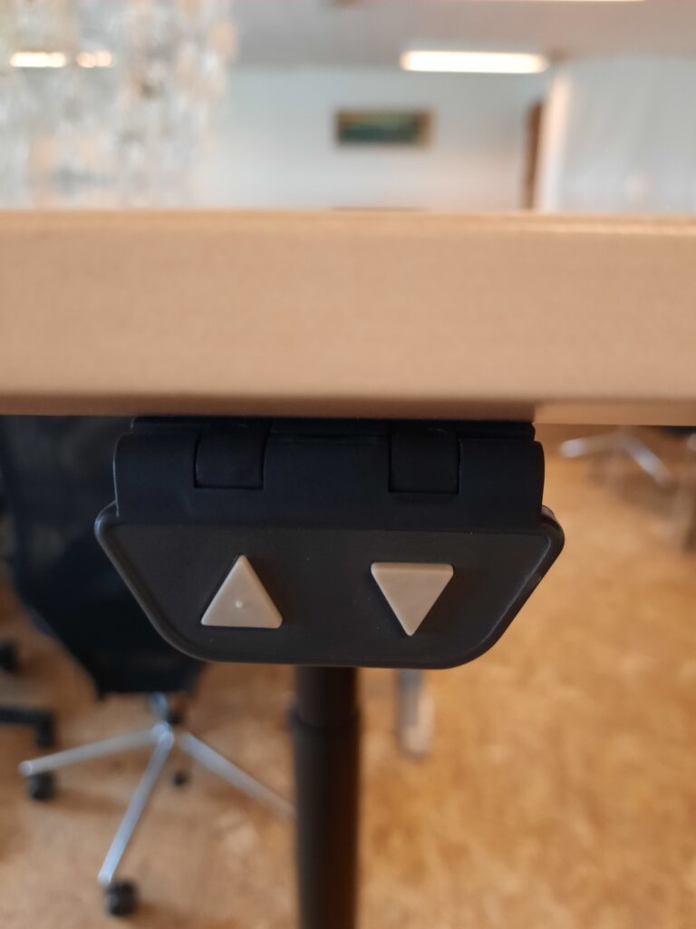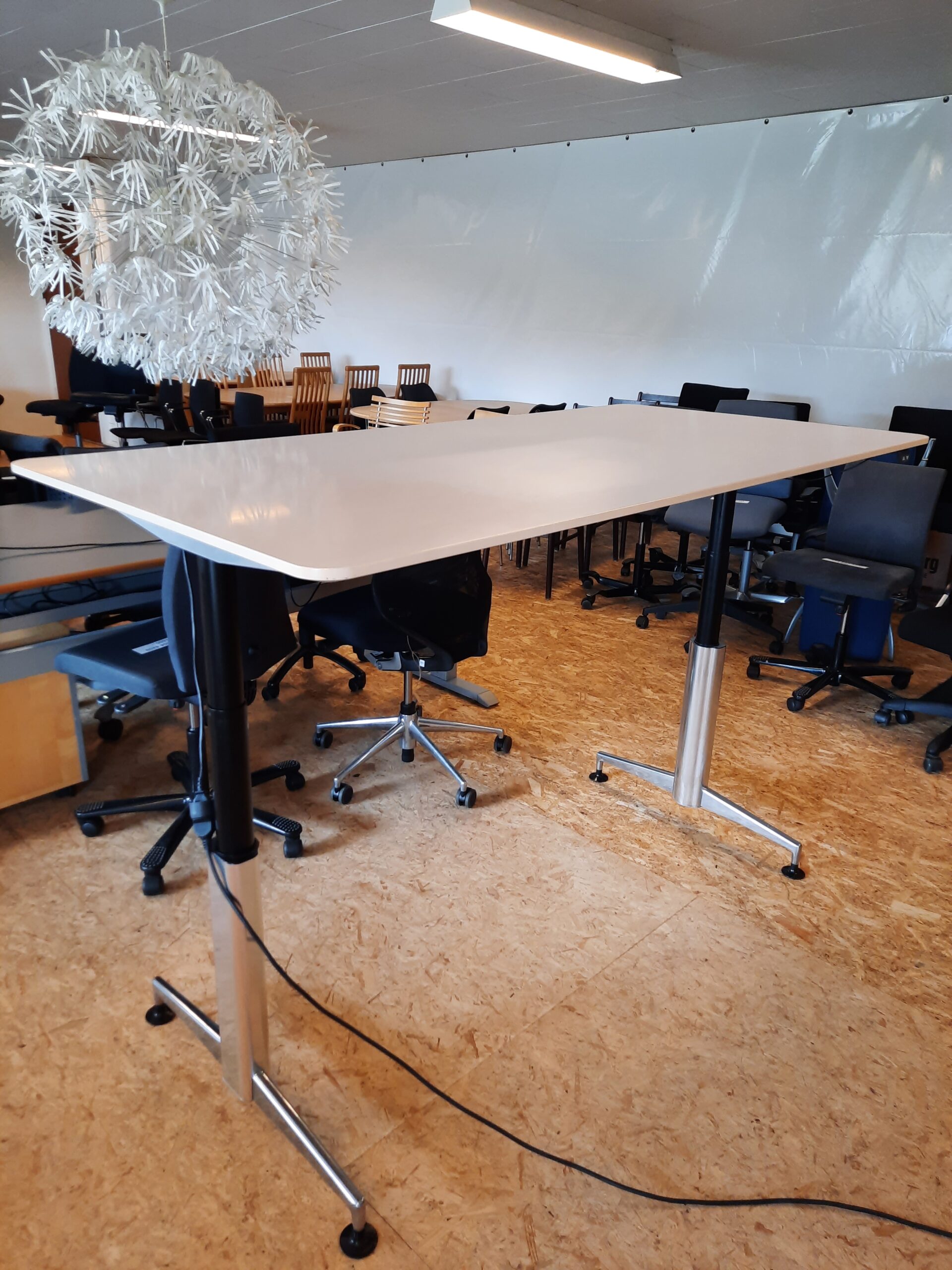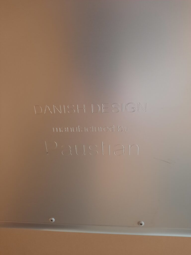 Super lækkert el hæve/sænkebord designet af Asger Soelberg. Modellen er A-One og bordpladen har en størrelse på 90×180 cm. Arbejdshøjden kan indstilles fra 70-134 cm. Stellet er i blankt aluminium, der er kabelbakke under bordpladen til ledninger og desuden kan man smart fastsætte ledning til hæve/sænk kontakten i en clips under pladen. Bordet er i pæn stand, med almindelige brugsspor, såsom mindre ridser og mærker på bordplade og stel.