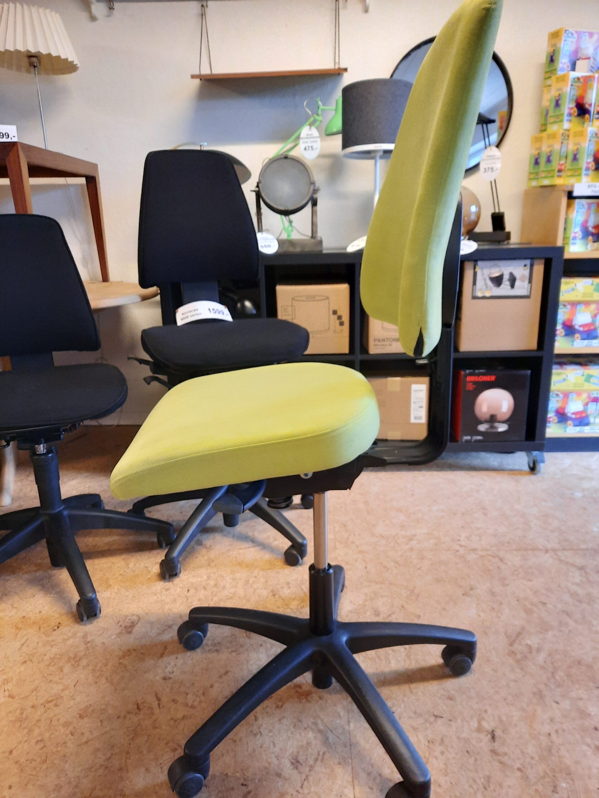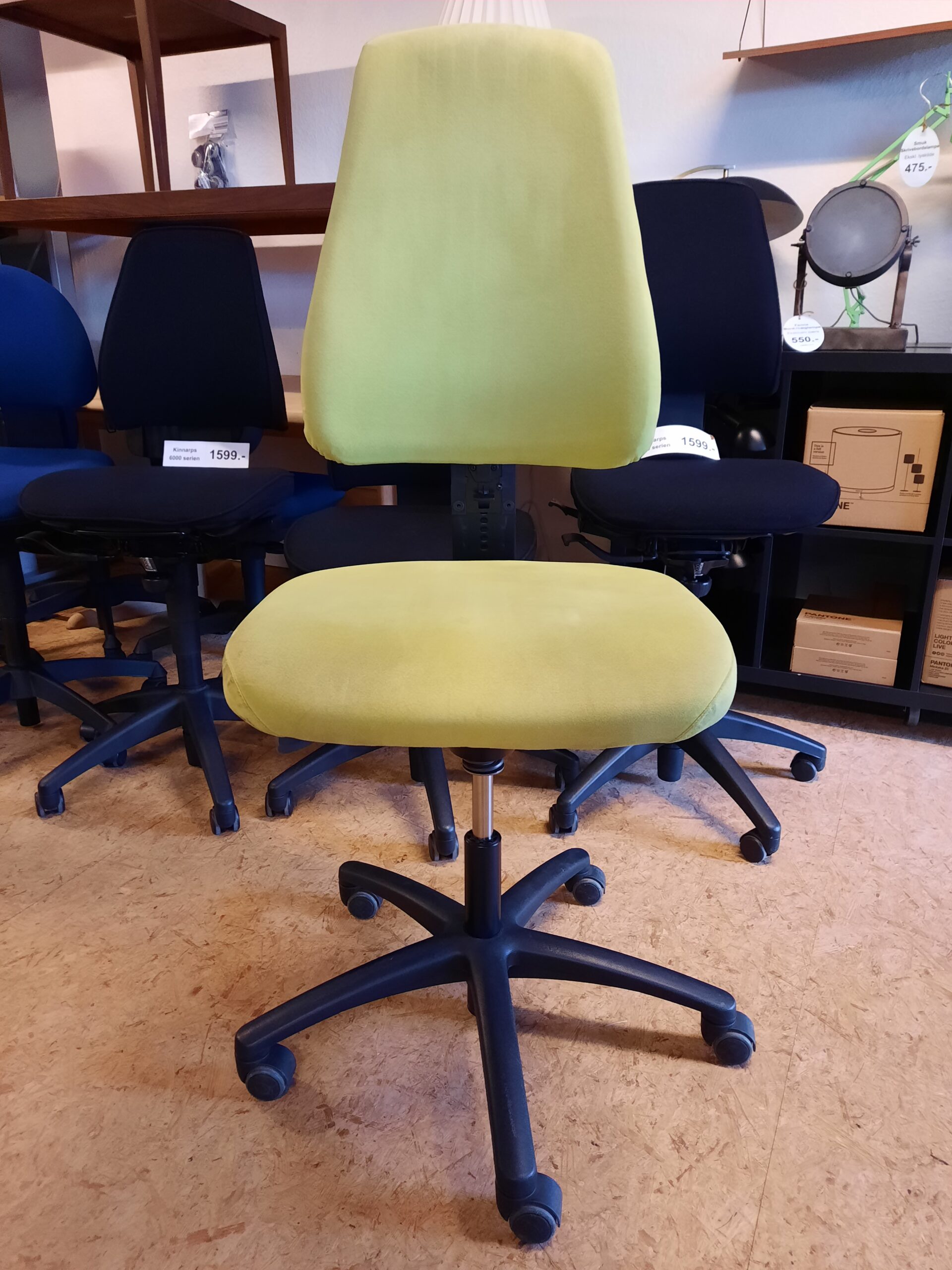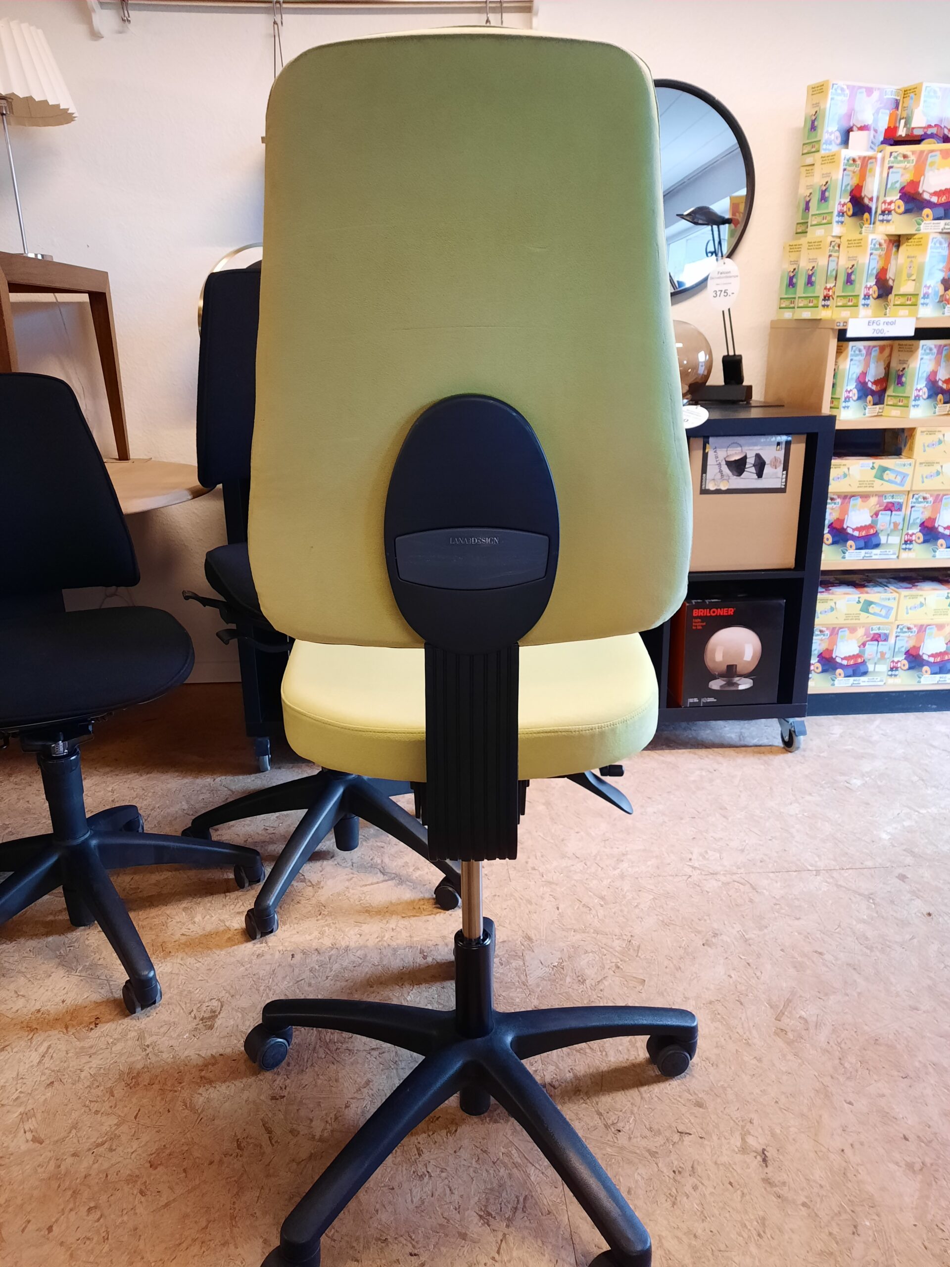 Lanab Design LD62 kontorstol med mellemhøjt rygstykke (ca. 52 cm). Stolen er betrukket med grønt stof og har flg. funktioner: sædeforskydning frem/tilbage, free float funktion eller fastlåsning i en ønsket position. Den kan vægtreguleres efter kropsvægt, rygstykket kan hæves eller sænkes, der er sædevip og endelig kan den højdeindstilles fra 48-62 cm. Hjul: velegnet til hårde gulve. Stolen er med nogle brugsspor, blandt andet i stoffet. Desuden mangler plastdæksel til vægtregulering. Stolen kan dog stadig vægtreguleres ved brug af f.eks. svensknøgle. Lagerbestand: 1 stk.