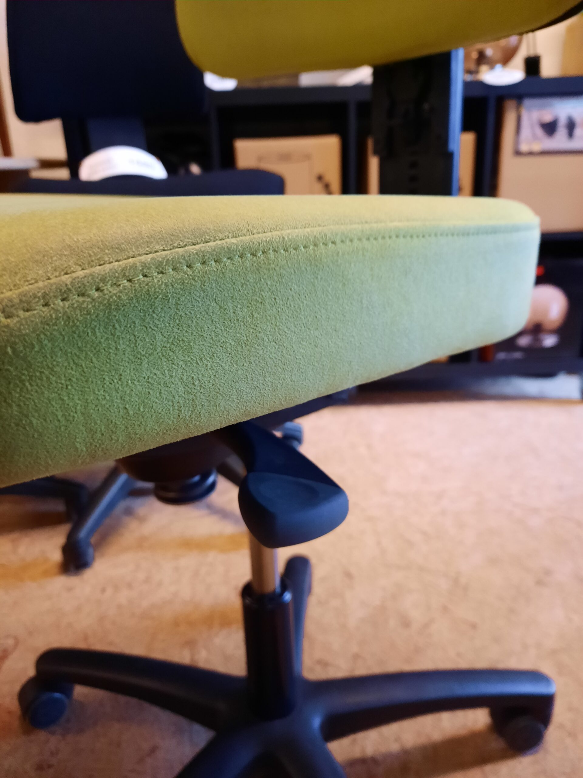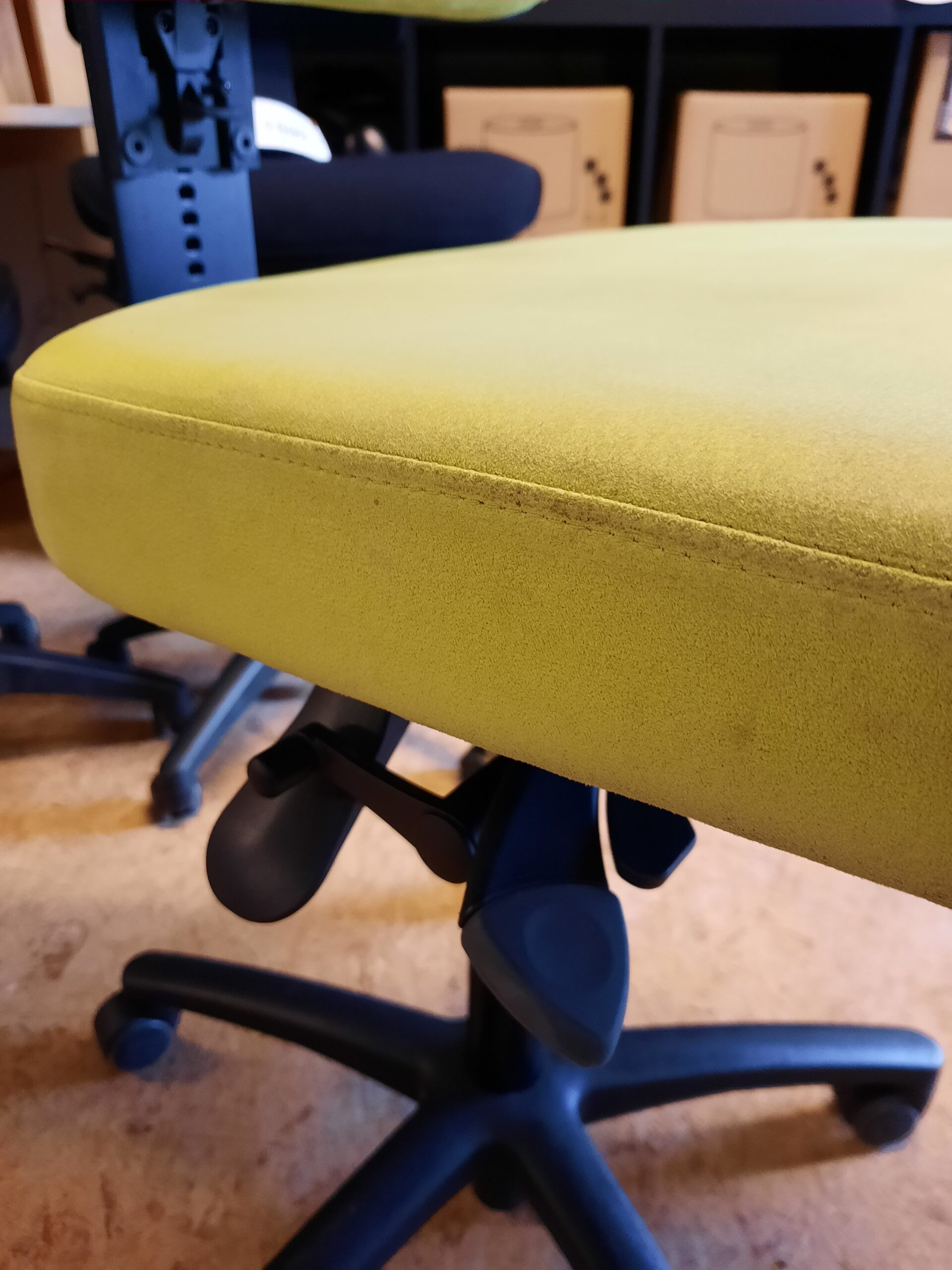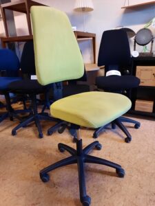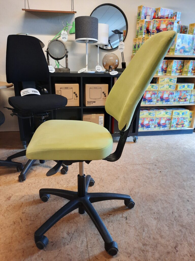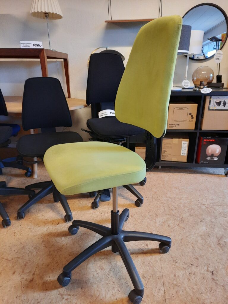 Lanab Design LD62 kontorstol med mellemhøjt rygstykke (ca. 52 cm). Stolen er betrukket med grønt stof og har flg. funktioner: sædeforskydning frem/tilbage, free float funktion eller fastlåsning i en ønsket position. Den kan vægtreguleres efter kropsvægt, rygstykket kan hæves eller sænkes, der er sædevip og endelig kan den højdeindstilles fra 48-62 cm. Hjul: velegnet til hårde gulve. Stolen er med nogle brugsspor, blandt andet i stoffet. Desuden mangler plastdæksel til vægtregulering. Stolen kan dog stadig vægtreguleres ved brug af f.eks. svensknøgle. Lagerbestand: 1 stk.