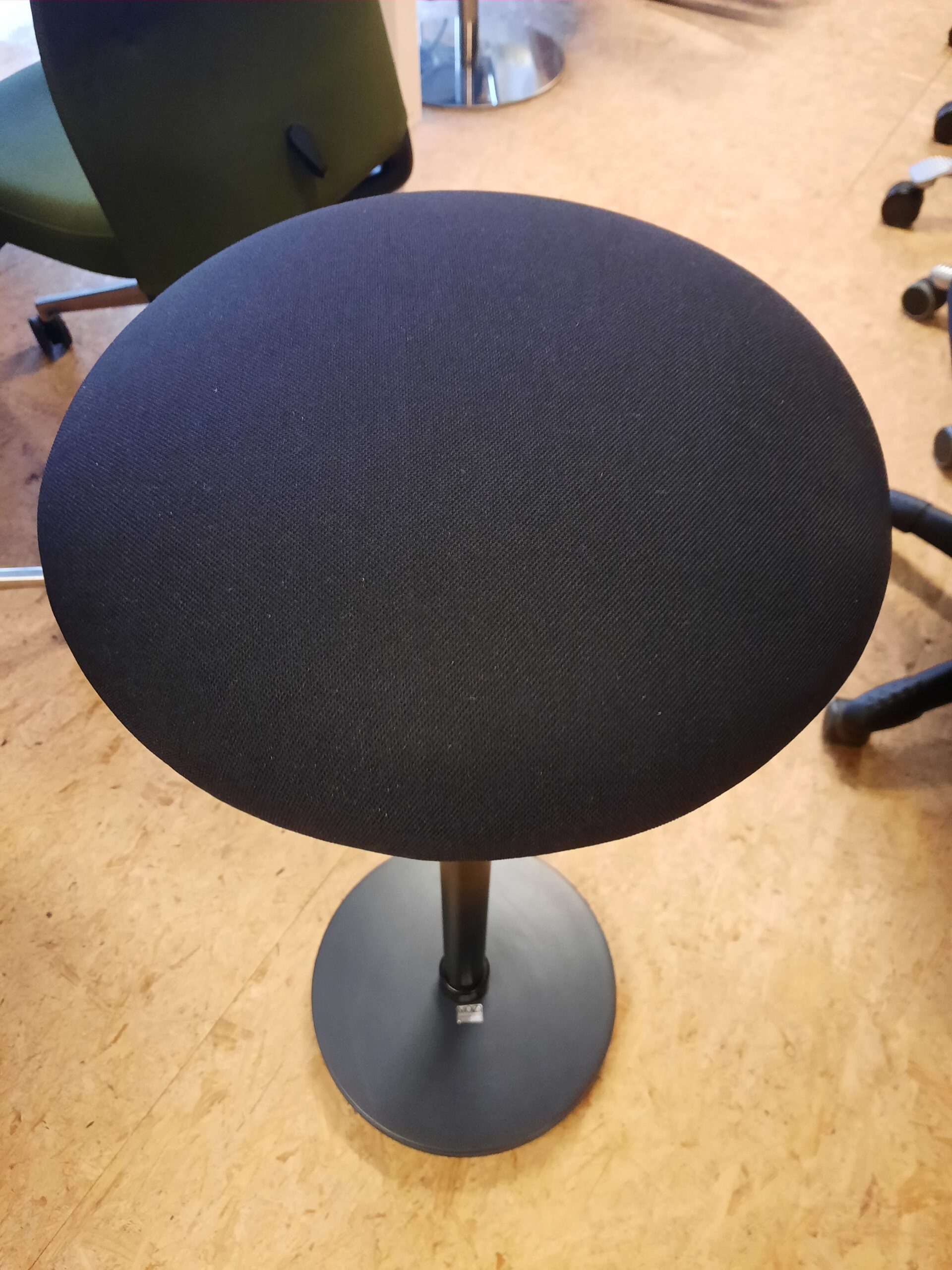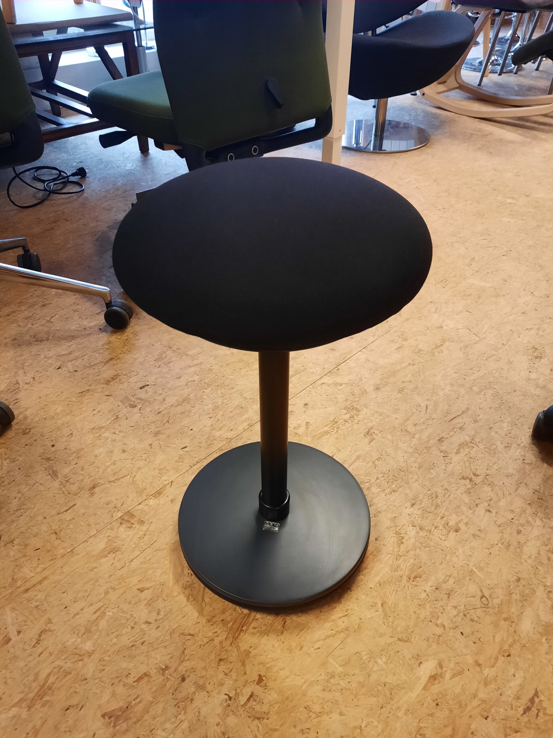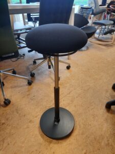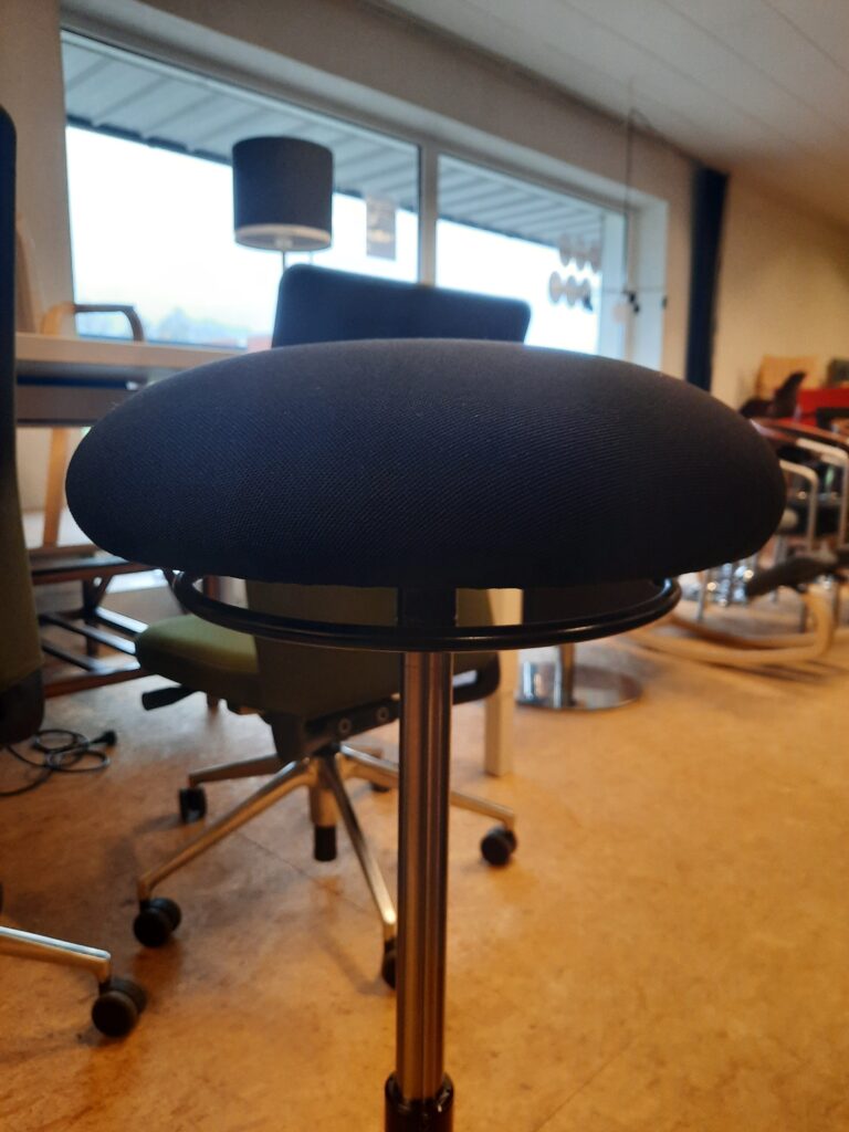 Moizi stå/støttestol med sort slidstærkt Fame stof. Støttestolen er god for kroppen og især rygmuskulaturen trænes pga. den konstant ændrende siddestilling. Så hvis du ikke ønsker, at blive for stiv i kroppen i løbet af arbejdsdagen, er stolen et godt valg for dig. Stolen er desuden pladsbesparende og vil passe fint ind på enhver arbejdsplads – også den hjemlige. Desuden er stolen en god aflastning til dig, som står meget op i løbet af dagen. Stolen fremstår i flot stand, med mindre brugsspor.
