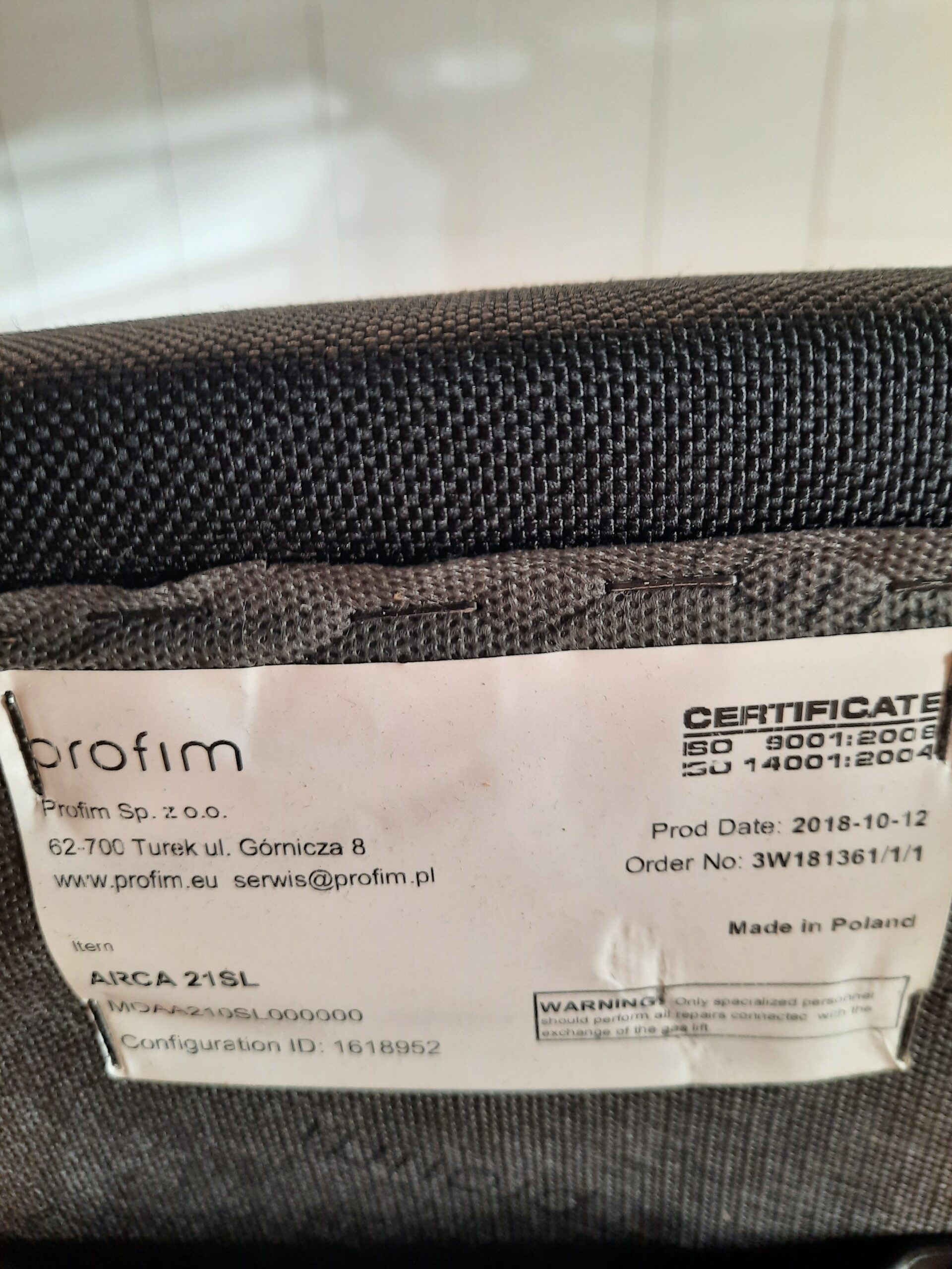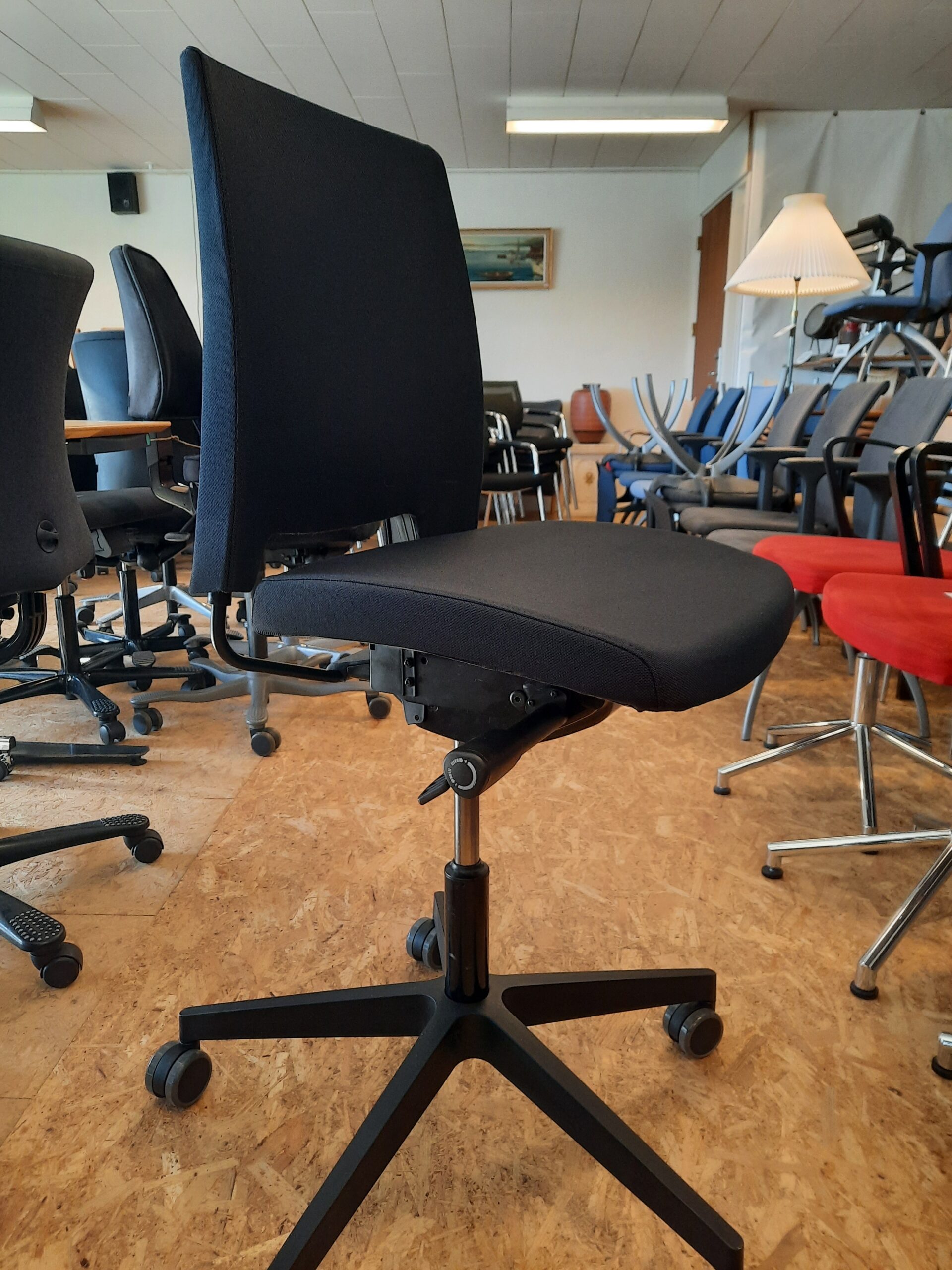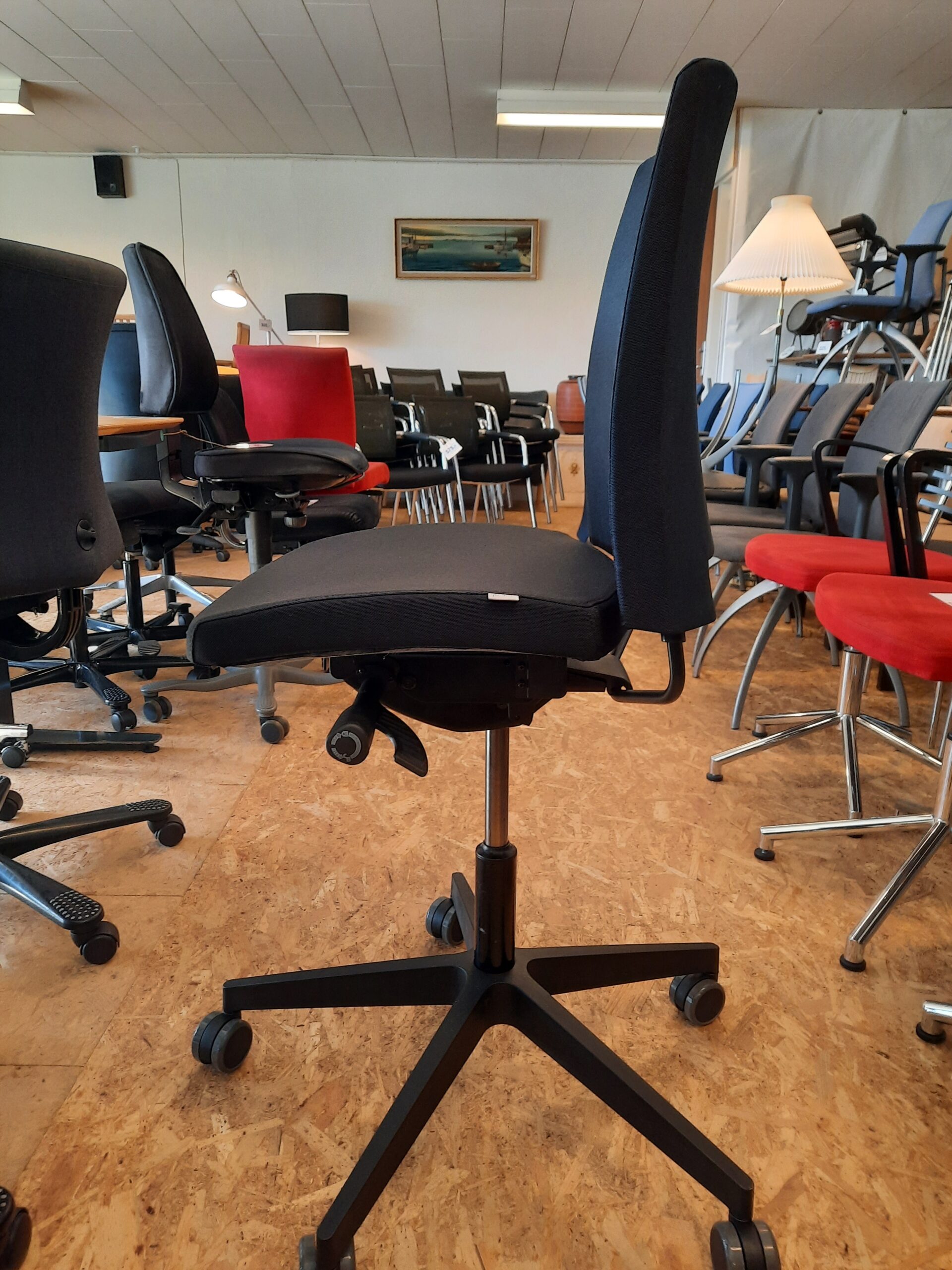 Profim kontorstol model ARCA 21SL. Elegant stol betrukket med sort stof. Stolen har justerbar siddehøjde fra 54-65 cm, højdejusterbart rygstykke, sædedybde regulering, free flow funktion, hvor stolen følger kroppens bevægelser eller fastlåsning i forskellige positoner, hvis det foretrækkes. Vippemodstanden kan også reguleres. Hjul: velegnet til hårde gulve. Fembenet fodkryds i sort. Stolen fremstår i flot stand, med minimale brugsspor. Bemærk, at den isatte gaspatron stammer fra en brugt HÅG stol. Lagerbestand: 1 stk.