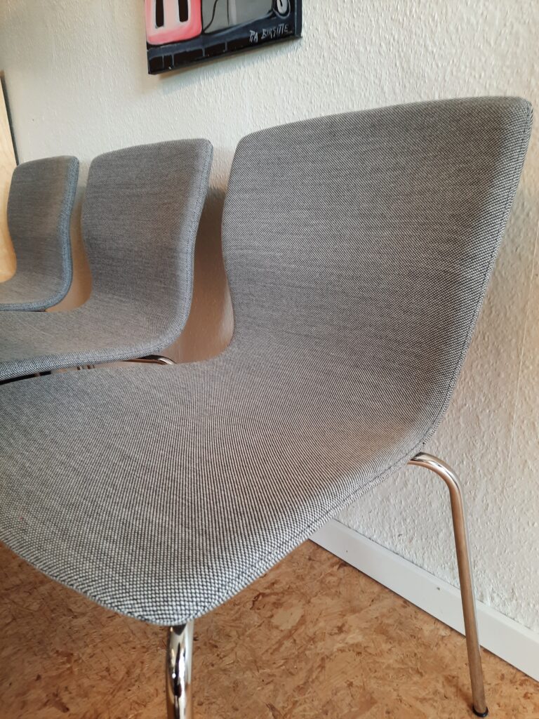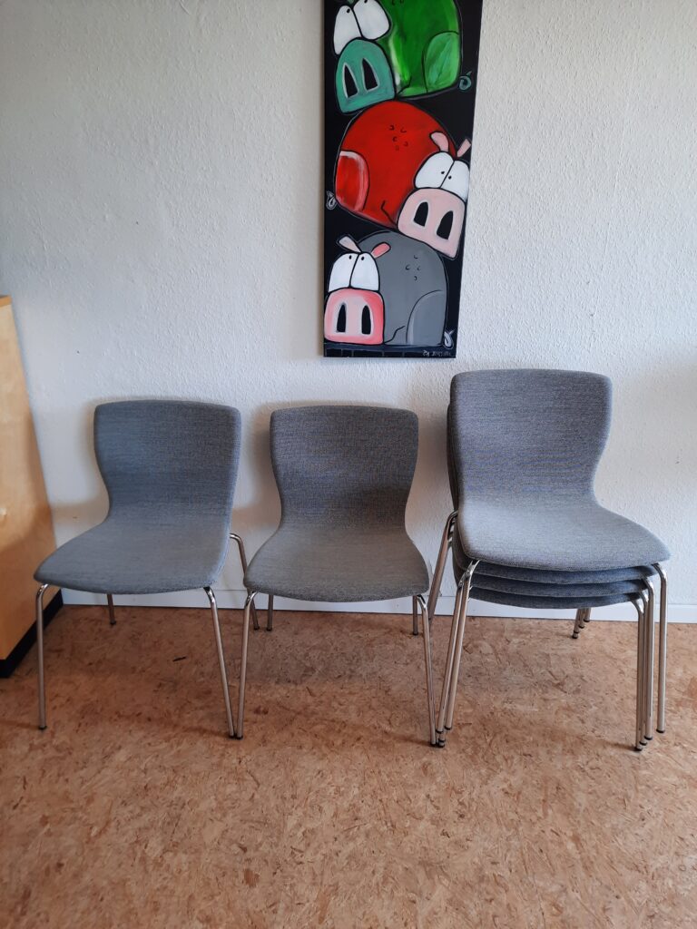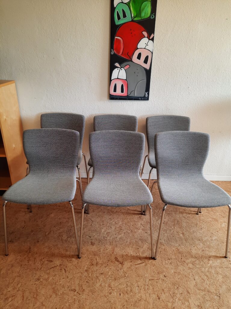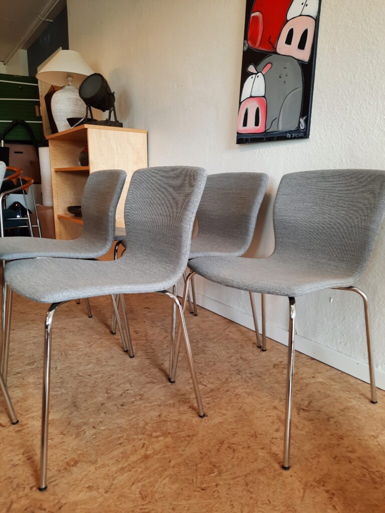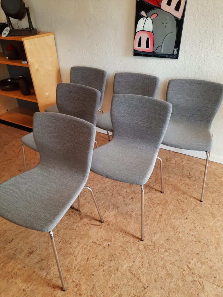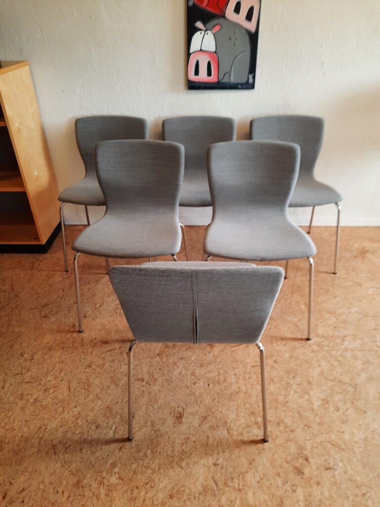 6 smukke spisebordsstole produceret hos Magnus Olesen og designet af Niels Gammelgaard. Stolene er med formbøjet ryg og sæde, som er polstret med gråt Maya stof, og stellet er af forkromet stål. Stolene er stabelbare og har en siddehøjde på ca. 46 cm. De fremstår i flot stand med minimale brugsspor.