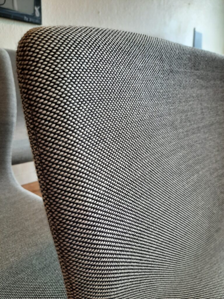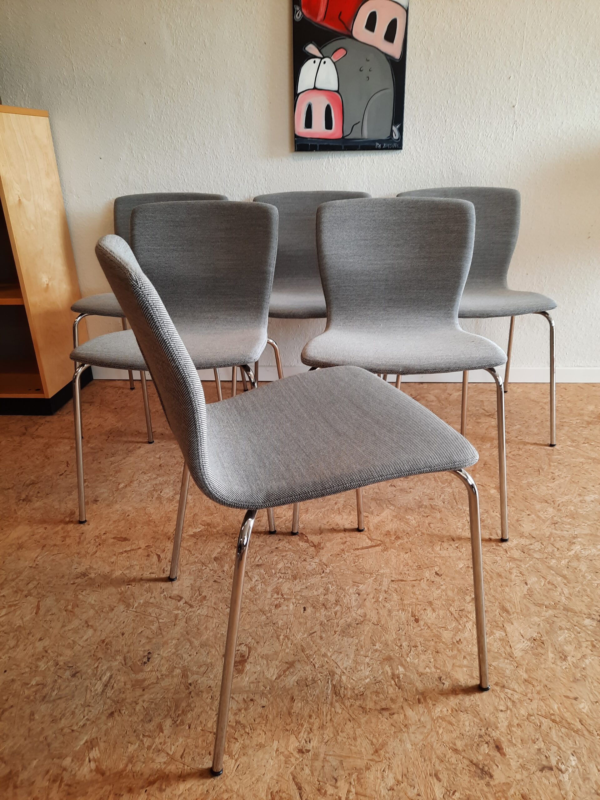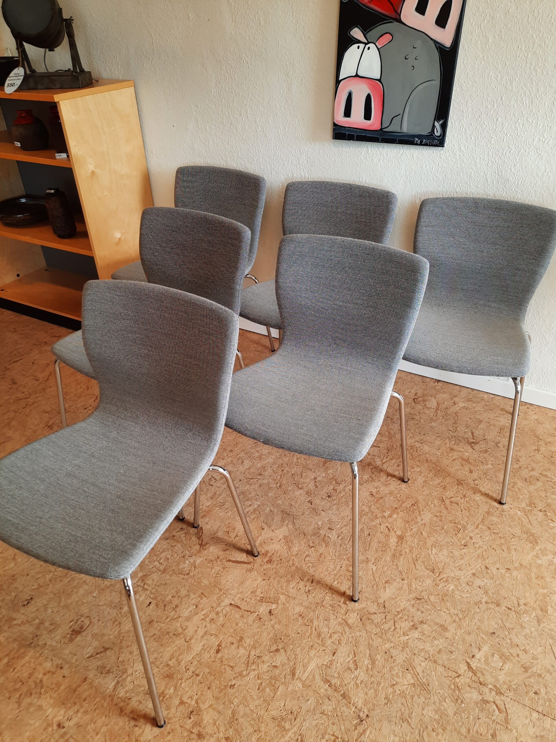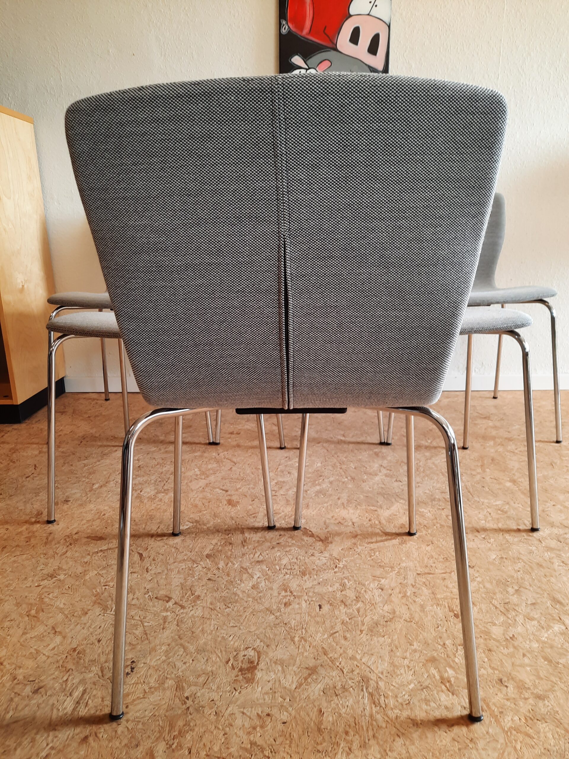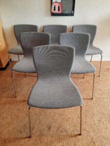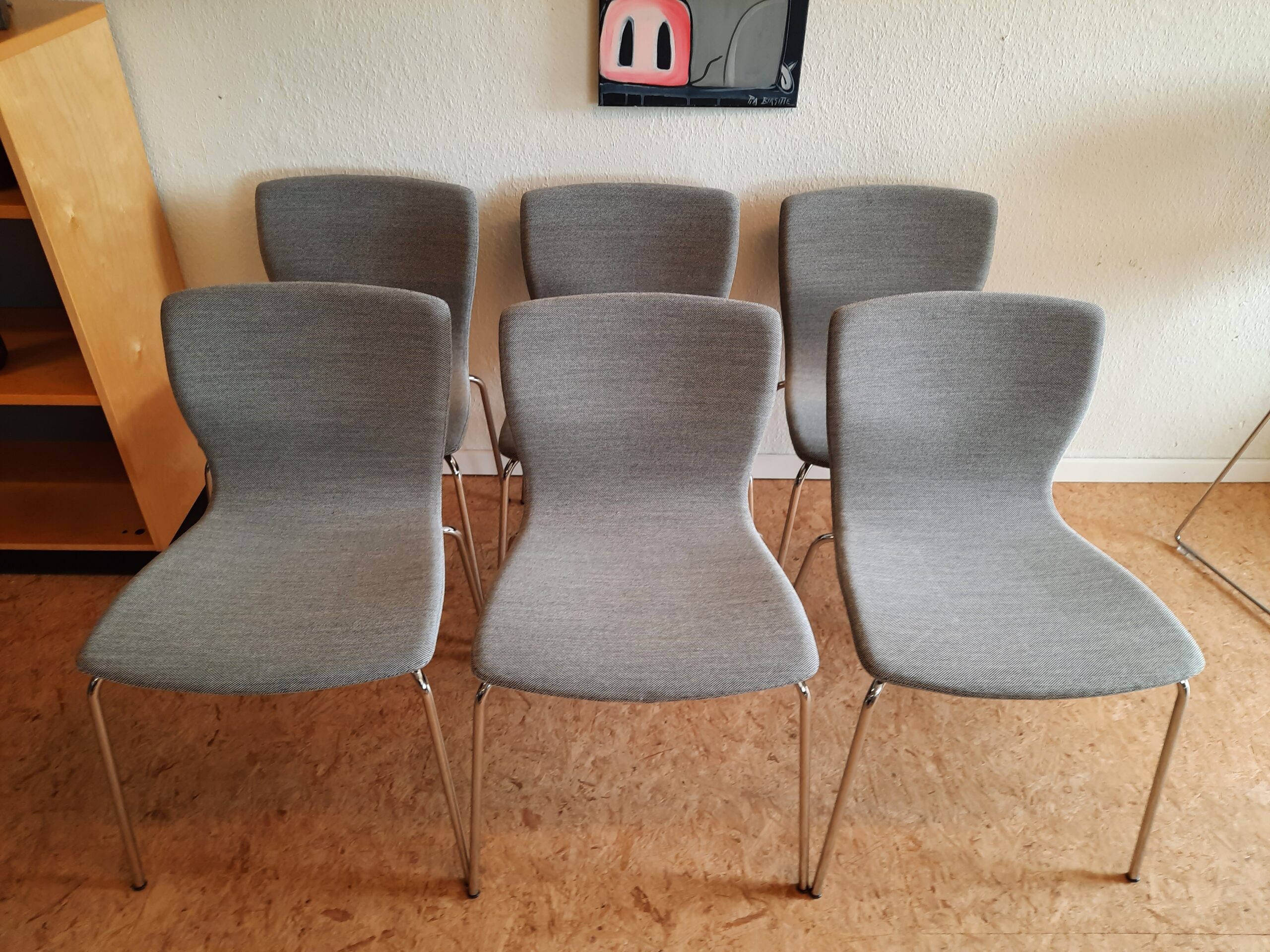 6 smukke spisebordsstole produceret hos Magnus Olesen og designet af Niels Gammelgaard. Stolene er med formbøjet ryg og sæde, som er polstret med gråt Maya stof, og stellet er af forkromet stål. Stolene er stabelbare og har en siddehøjde på ca. 46 cm. De fremstår i flot stand med minimale brugsspor.