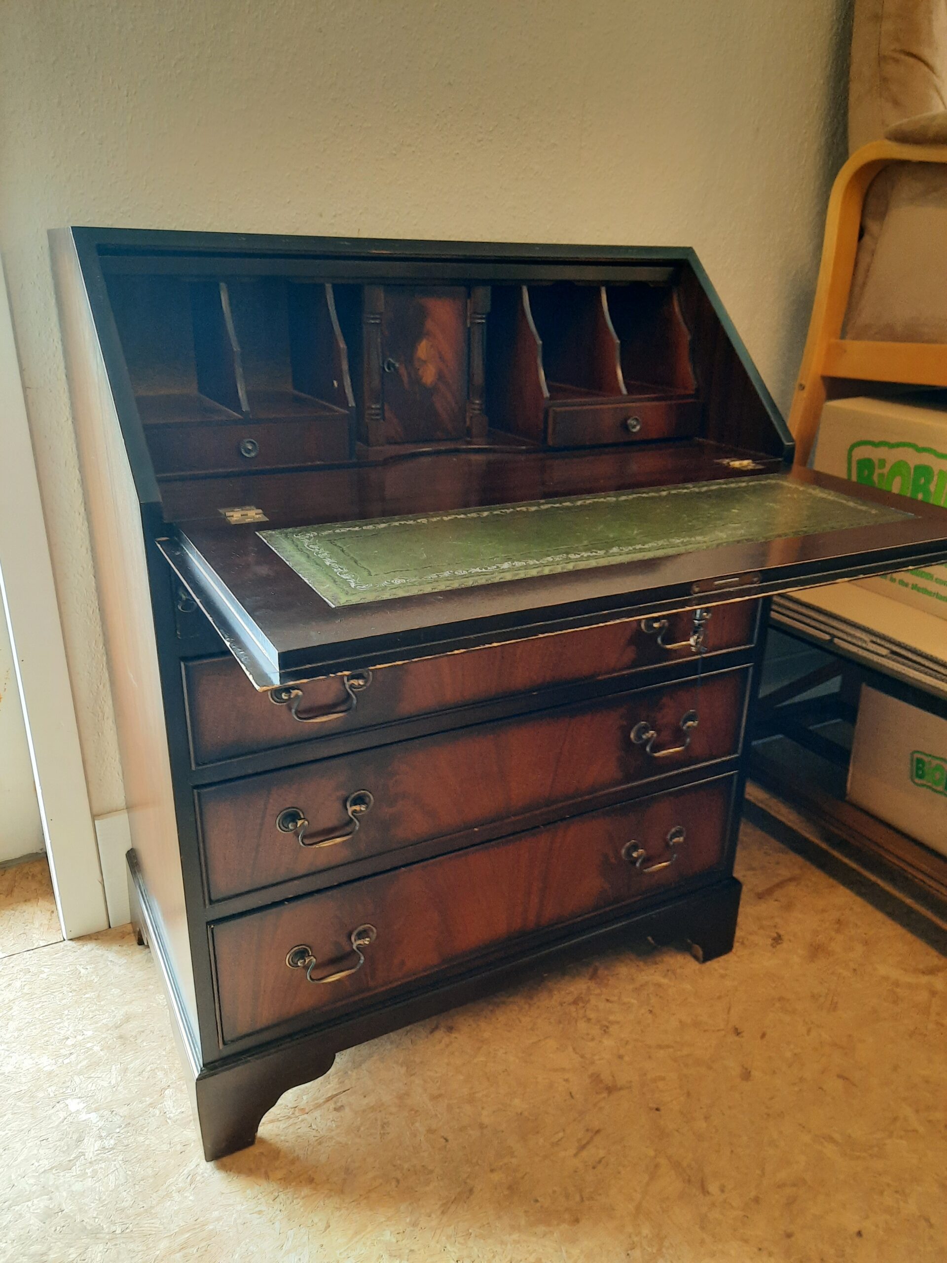 Charmerende og stilfuldt ældre chatol/sekretær, i solid britisk kvalitet. Chatollet er med 4 store skuffer, med fine messinggreb, forneden. Øverst, kan lågen foldes ud og smart bruges som skriveplade. Derudover er der små fine skuffer og andre mindre opbevaringsrum bag pladen. Chatollet er produceret af det (tidligere) walisiske firma Bowlings of Tenby. Chatollet har flg. mål: Højde 97cm, Længde 77,5 cm og Bredde/dybde 47cm. Chatollet er i pæn stand, dog med aldersrelaterede brugsspor, såsom skrammer/ridser på blandt andet toppladen. Smuk nøgle medfølger.