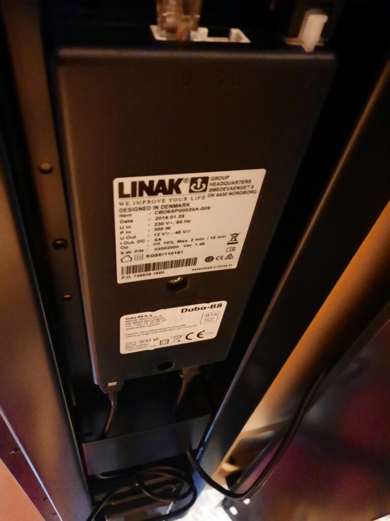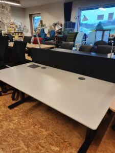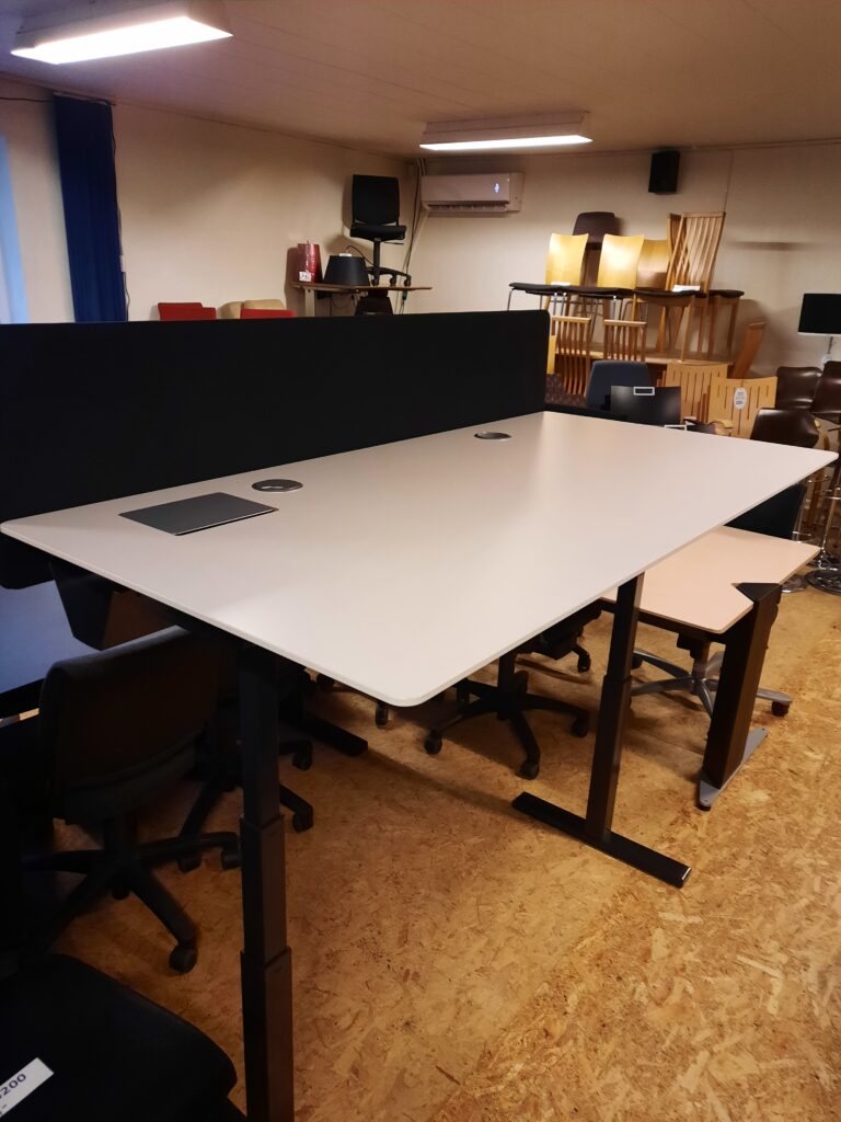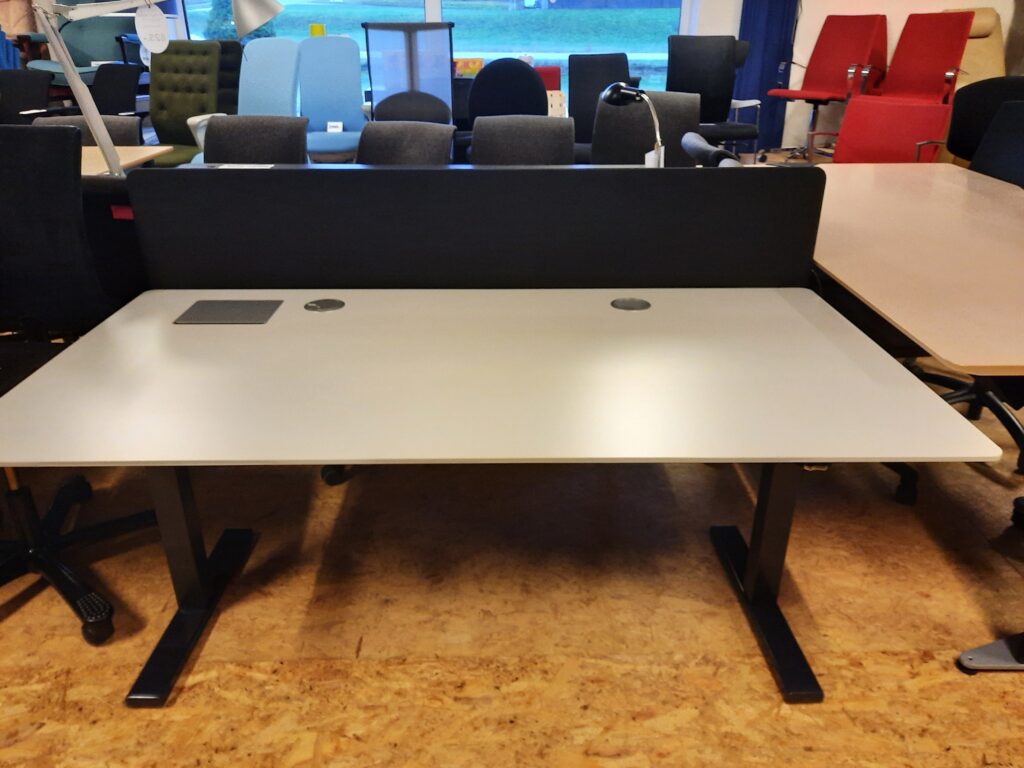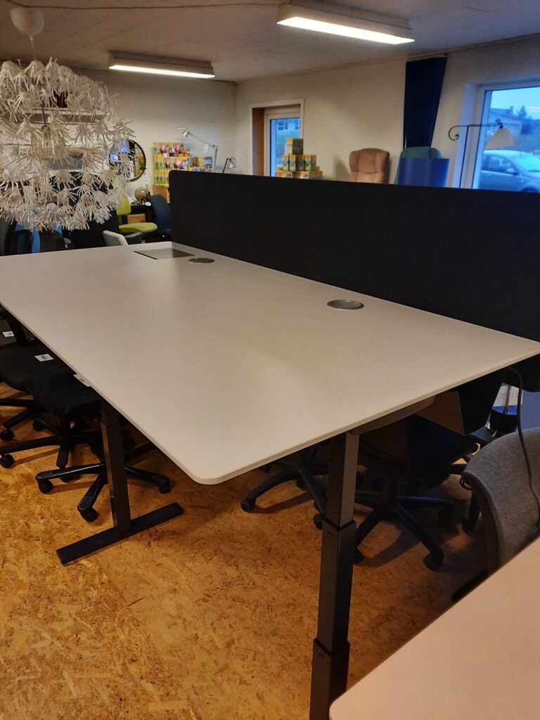Duba B8 el hæve/sænkebord str. 160×80 cm. Bordpladen er i hvid laminat. Bordet er med grå støjisoleringsvæg og gråt stel på højdejusterbare fødder. Arbejdshøjden kan indstilles fra 64,5-129,5 cm. Bordet er med hæve-/sænkekontakt i højre side, hul til ledningsgennemføring i højre side/midtfor, samt ledningsgennemføringshul med dæksel i venstre side og et et større ledningsgennemføringshul med dæksel også i venstre side – til f.eks. skærmledninger osv. Derudover er bordet med Linak styreboks og der er kabelbakke monteret under bordpladen. Bordet fremstår i flot stand, med mindre brugsspor.