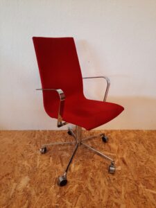 Gate stolen er en smuk og stilfuld stol i rødt alcantara stof. Stolen er med smukke armlæn, der ligesom resten af stellet, er i forkromet stål. Siddehøjden er ca. 45 cm. Stolen er med vippefunktion. Fembenet fodkryds i forkromet stål. Hjul: velegnet til hårde gulve. Stolen fremstår med almindelige brugsspor, såsom ridser/mærker i stel og på stof. Lagerbestand: 6 stk.