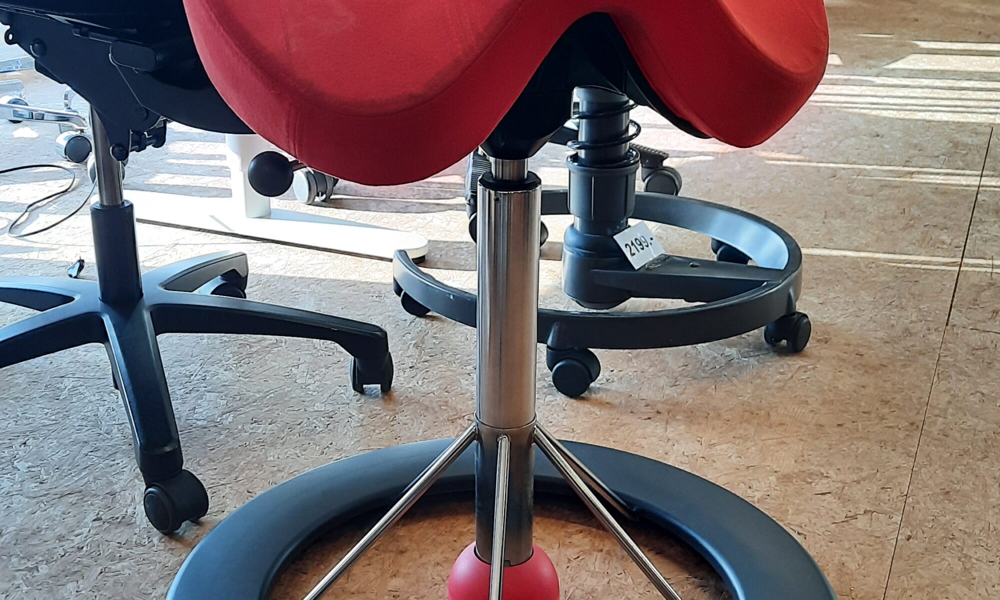 BackApp rygstol/kontorstol betrukket med rødt alcantara mikrofiber stof. Styrk din ryg imens du arbejder ved computeren. Den ergonomiske BackApp sadelstol styrker dine muskler omkring rygsøjlen, blot ved at du sidder på den. Samtidigt med at rygmusklerne trænes, forebygges rygproblemer, og brugeren holdes samtidig aktiv under ellers stillesiddende arbejde. Stolen giver desuden en korrekt siddestilling. Fødderne placeres på den runde stolering i bunden, og den røde kugle bevirker, at stolen kan vippe til alle sider i 360 grader. Stolen fremstår med almindelige brugsspor. Siddehøjde fra ca. 65-85 cm.