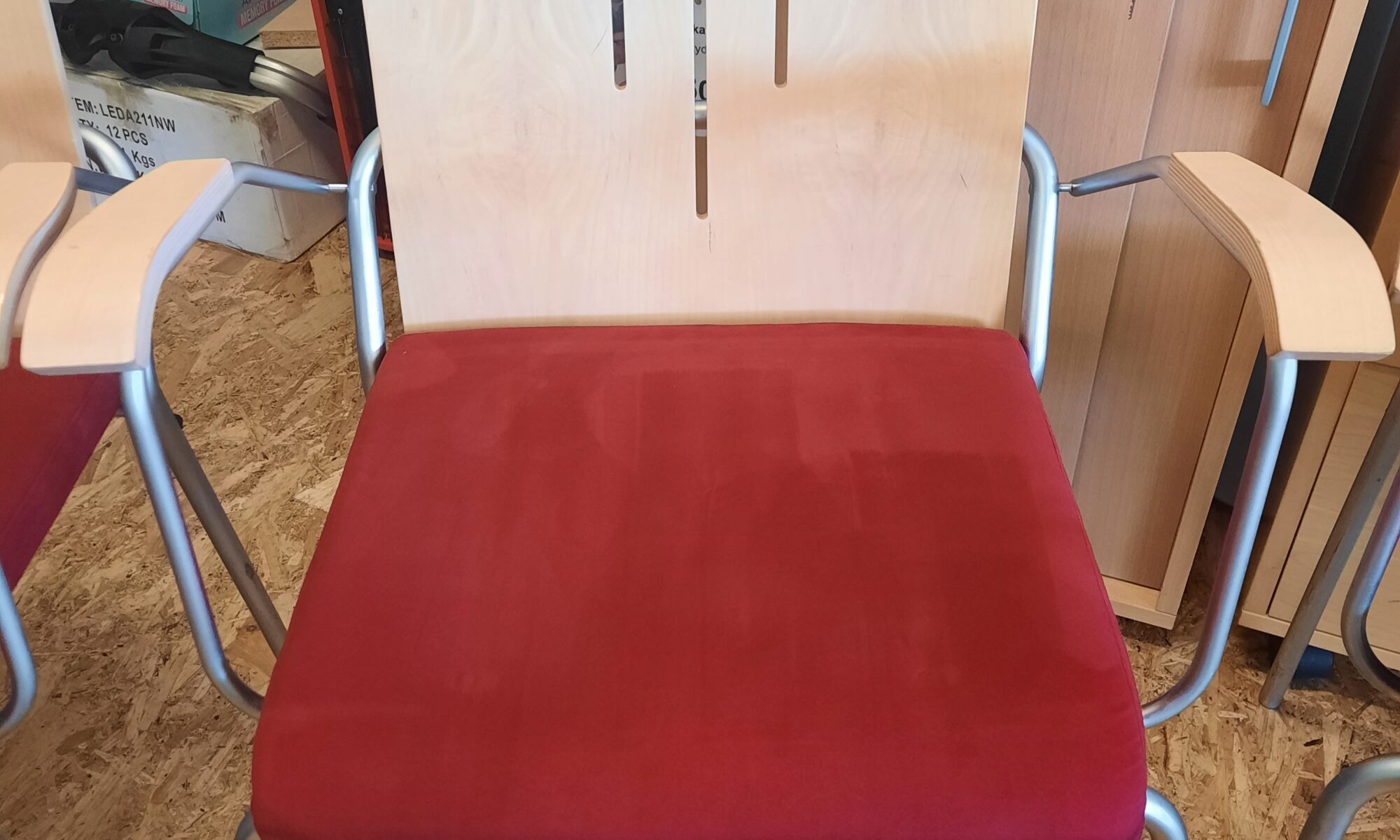 Smukke armstole med rygstykker og armlæn i ahorn træ. Sæder er polstret med rød alcantara stof. Stellene er i forkromet stål. Stolene er stabelbare, og de har en siddehøjde er 47 cm. Lagerbestand 4×4 stk. Stolene fremstår med brugsspor, såsom trykmærker i stoffet og ridser/mærker i træet.