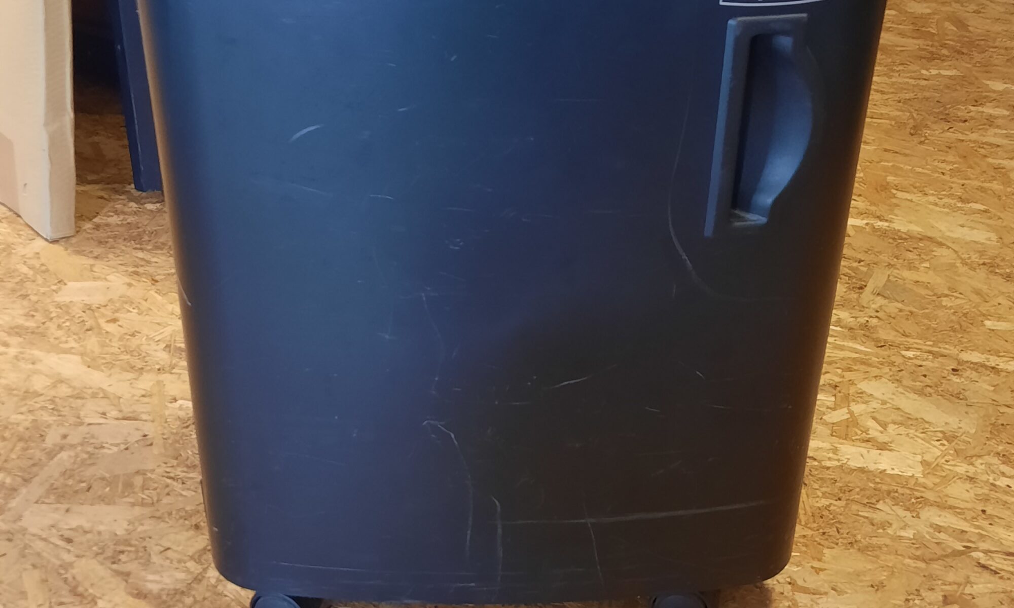 Makulator af mærket “Fellowes”. Makulatoren er med frontlåge, som kan åbnes, når papirspanden er fyldt op og skal tømmes. Makulatoren lyser, når den skal tømmes. Ca. mål: 60Hx42Bx30D. Makulatoren fremstår med en del brugsspor (blandt andet lille revne i siden), men den fungerer fint.